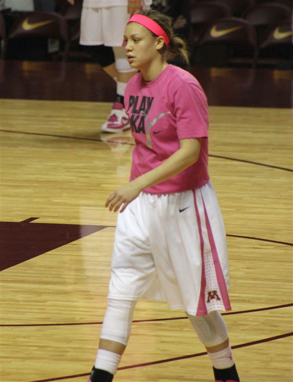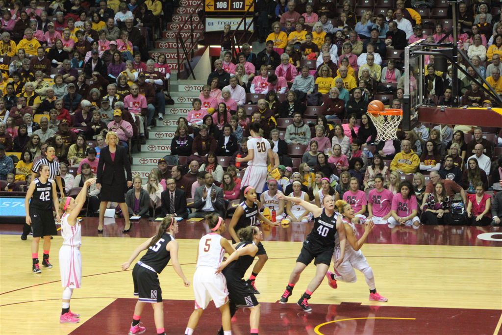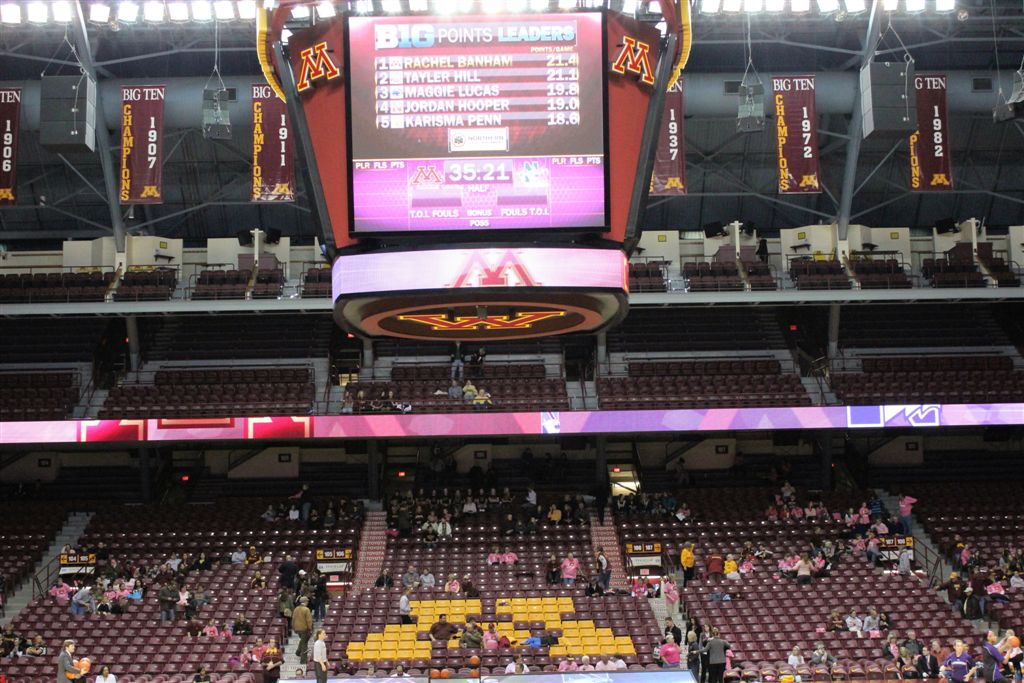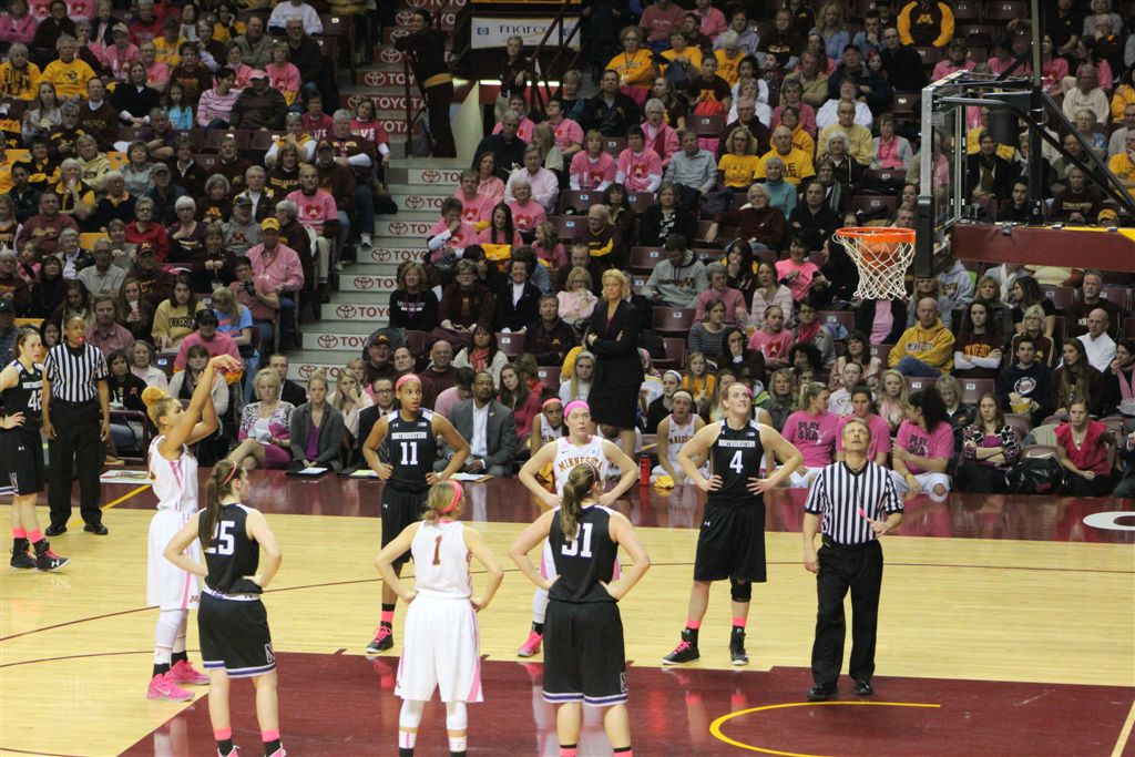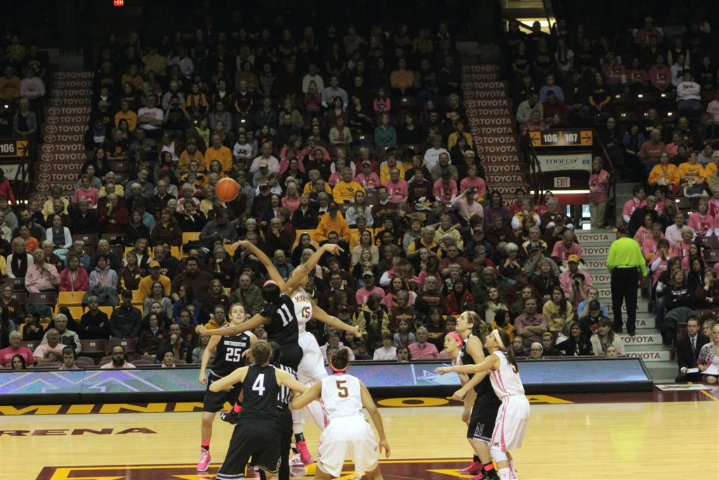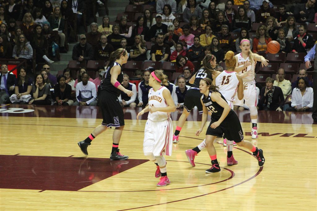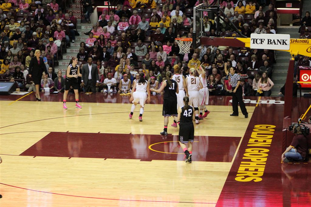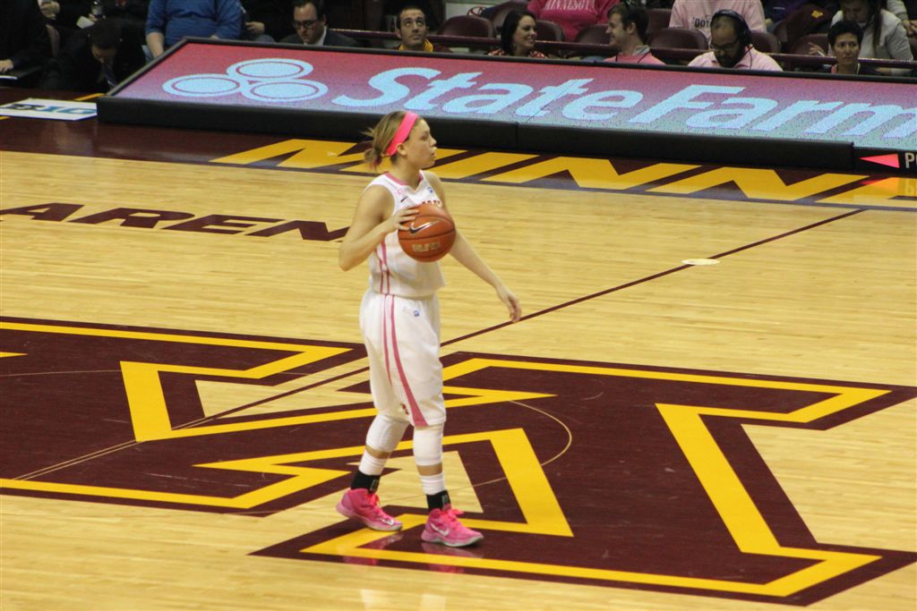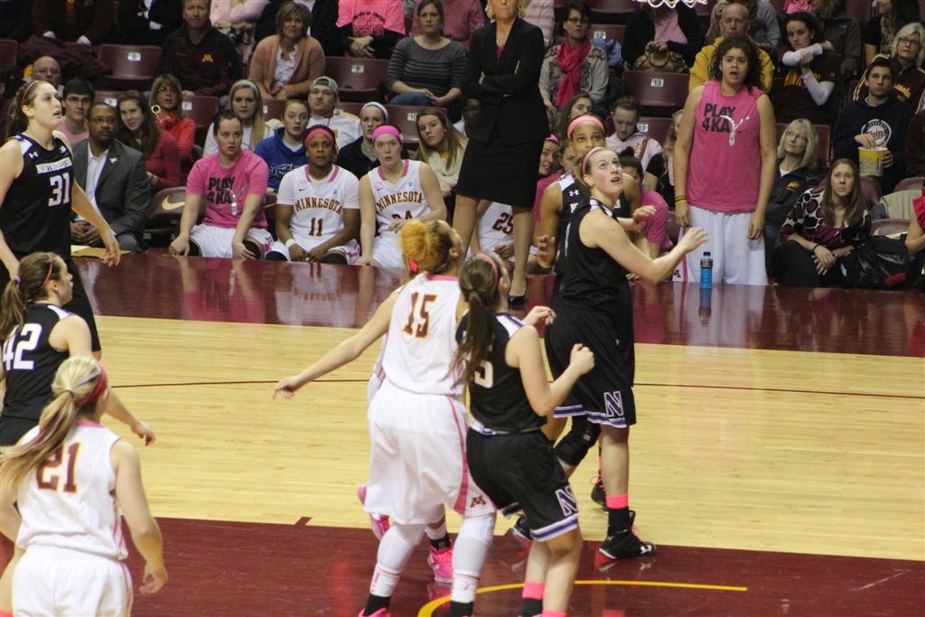 So now it’s the next day, Sunday. We went to Williams Arena to see the Gopher women’s basketball team play Northwestern. I have to be honest here – the Gophers are having an average year. I went to see Rachel Banham play. Rachel (1) is a 5’9″ sophomore guard from Lakeville and she leads the Big Ten in scoring. All the years Lindsay Whelan was starring for the Gophers, we always said we were going to gone down to see her play. We never did. I did not want to miss the next Lindsay Whelan.