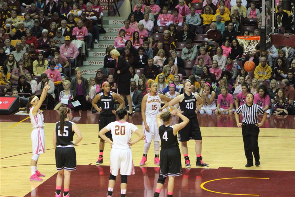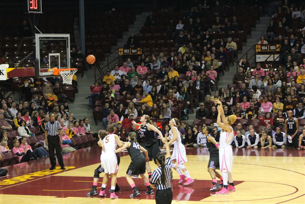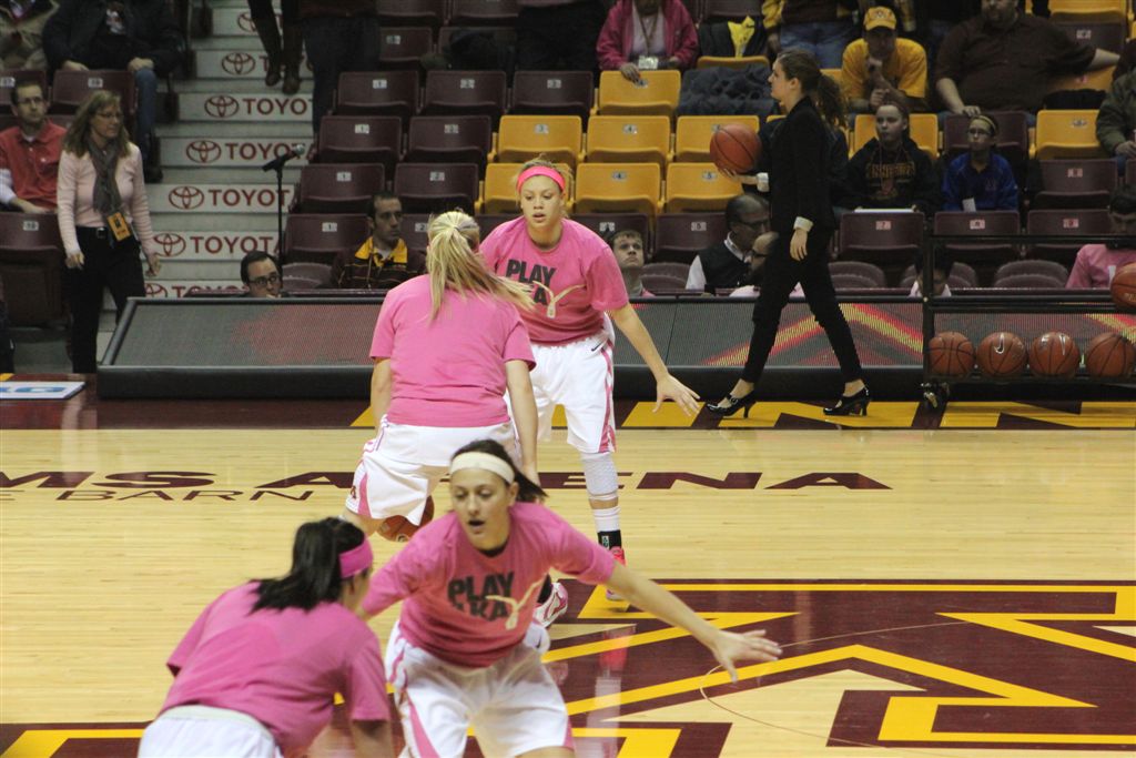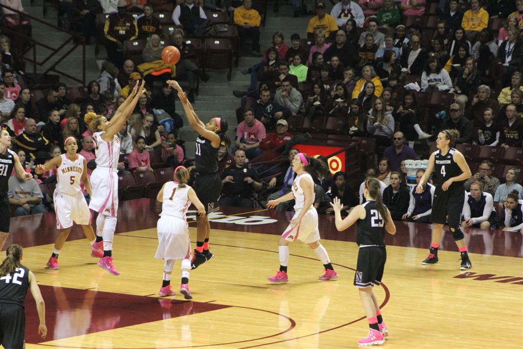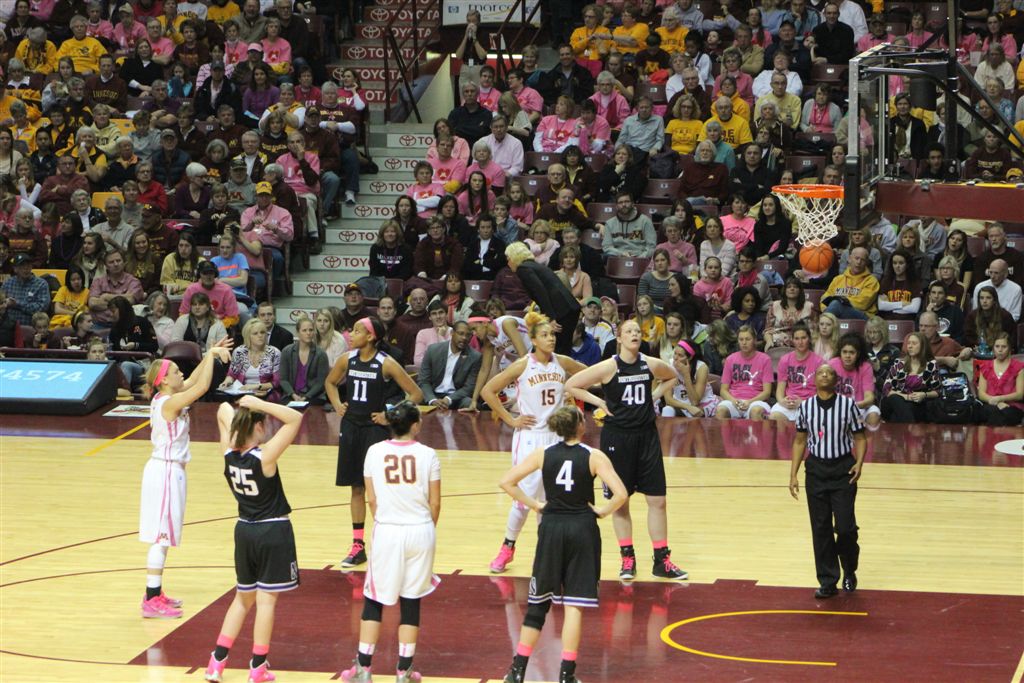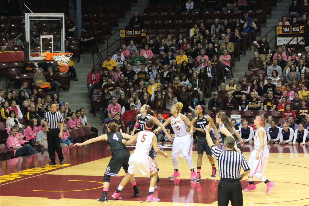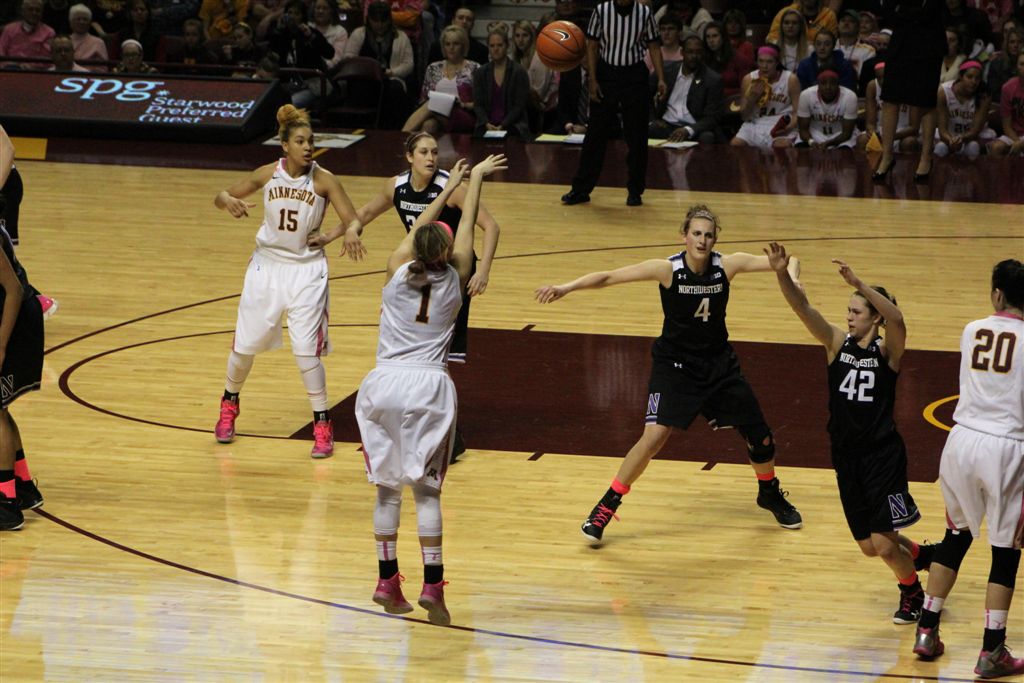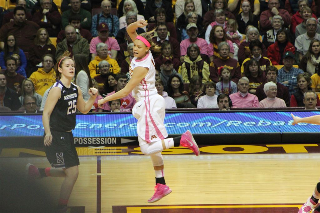 So now it’s the next day, Sunday. We went to Williams Arena to see the Gopher women’s basketball team play Northwestern. I have to be honest here – the Gophers are having an average year. I went to see Rachel Banham play. Rachel (1) is a 5’9″ sophomore guard from Lakeville and she leads the Big Ten in scoring. All the years Lindsay Whelan was starring for the Gophers, we always said we were going to gone down to see her play. We never did. I did not want to miss the next Lindsay Whelan.