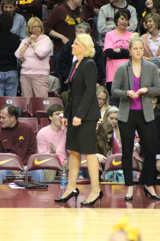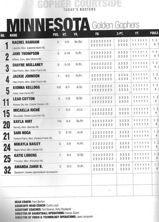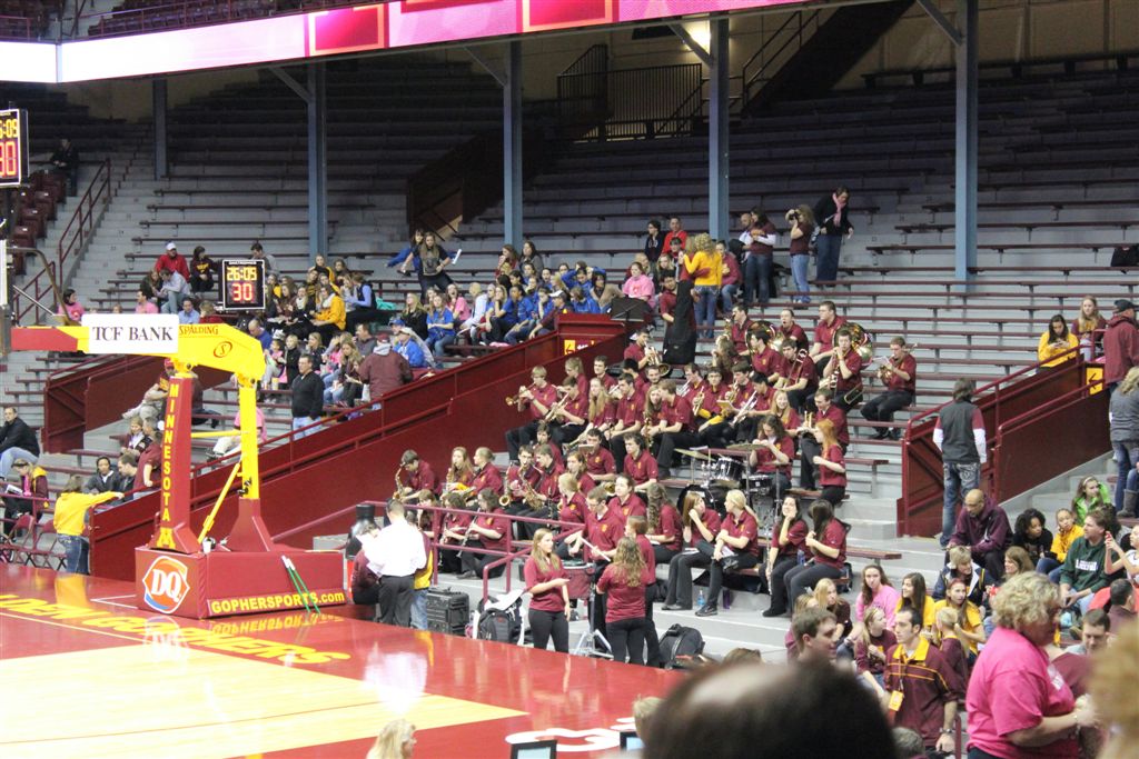 [You may have noticed we switched positions at the half. We had a loud-mouthed Gopher fan behind us in the first half so we decided to seek asylum in the corner for the 2nd. Minnesota may be the State of Hockey, but basketball is still the bigger draw. I can’t understand how an average basketball team with one star player can attract more fans than the possibly best college hockey team of all-time with several Olympians to be on the team?]