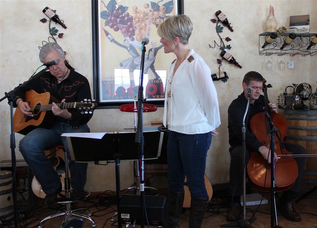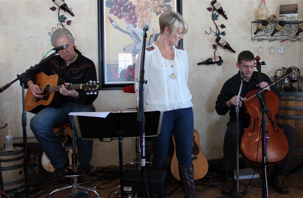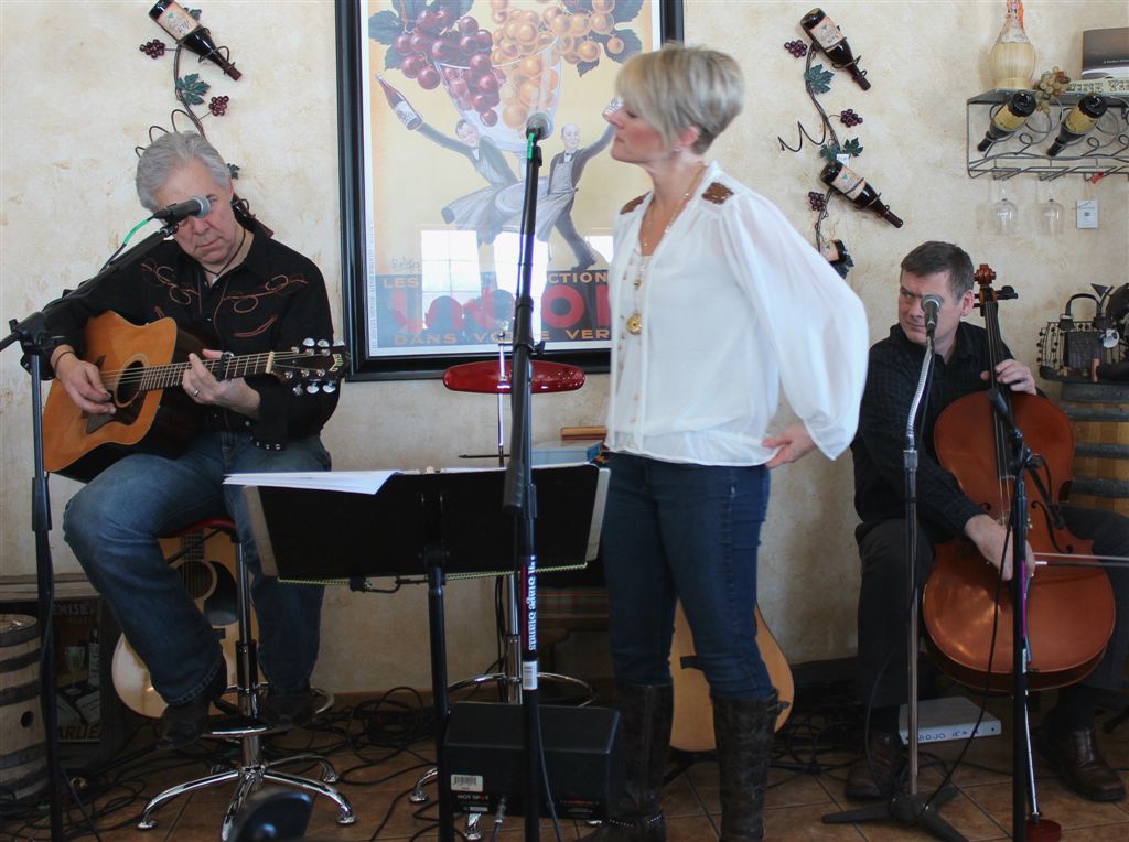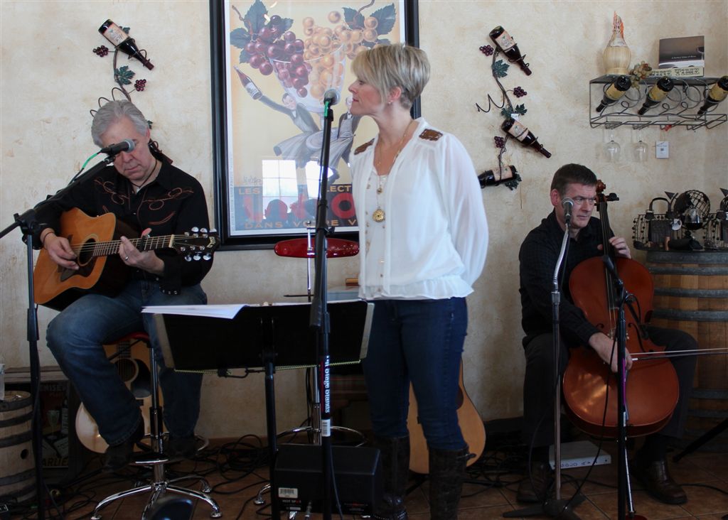 [On Saturday, Harper’s Chord made their winery debut. Again, the weather was iffy – particularly for Jill coming from Little Falls (who admitted to getting lost) and Roger and Paul coming from St. Cloud. But maybe because of pent up cabin fever, the place was SRO for at least the first couple hours of their performance. “Weakie” Annen, with Viv and Angie in tow, was there for the 1st hour as he wanted to visit with Jill, a fellow New Ulmer . . . New Ulmite? . . . New Ulmian? The group will be back at the winery on May 25th – do you think they’ll be able to perform outside by then?]