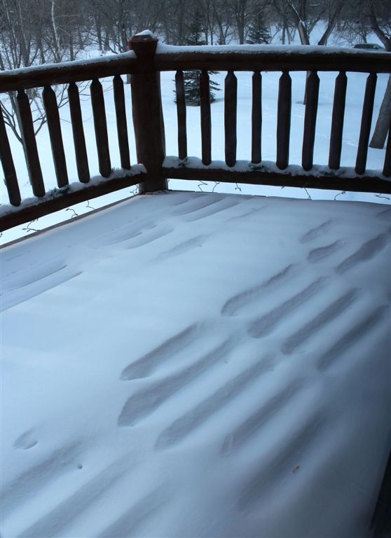 [The blizzard this past weekend left these odd markings on our deck. Apparently the winds were strong enough to suck snow through openings between the boards?]