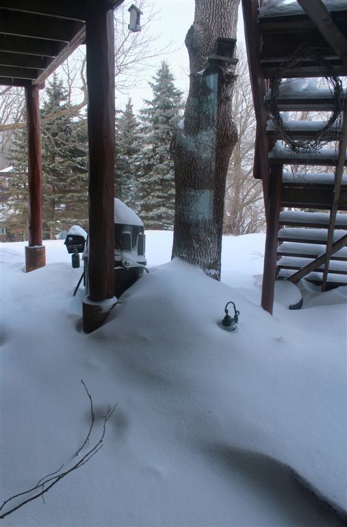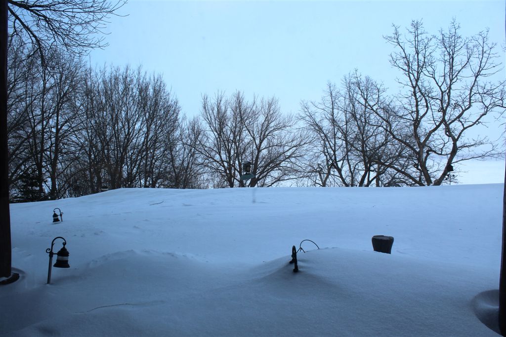 This has been our worst winter – for ice and snow – in our 12 years here! And winter has just been February and March. We get a 3-5″ snowfall about every 3rd day. Just about every morning I amble out in my bathrobe, jacket, and sockless boots to shovel the slab, the snowplow ridge at the end of the driveway, and the mail and newspaper boxes, that now have about 6″ of ice at their bases I can’t move. We’ve been 20 degrees below normal temps most of this month – and they’re saying we won’t hit 50 degrees in March (how ’bout 40?). They say Minneapolis could hit 41 by next Tuesday – still below normal, but Scandinavians will be running naked in the streets!