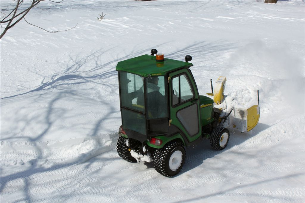 [The cut of the snowblower reveals the drift height across the driveway.]
