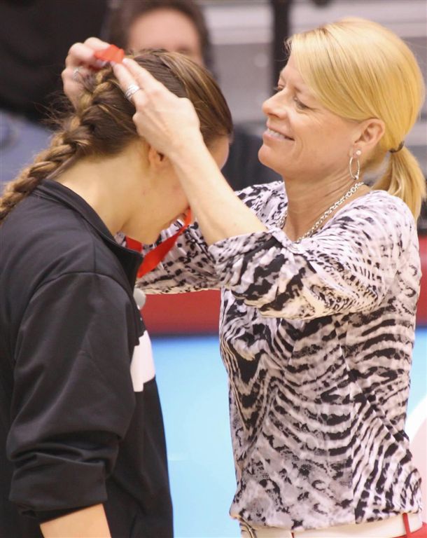 [She greets Otter star Brianna Rasmusson. They will renew their up-close and personal relationship during the game.]