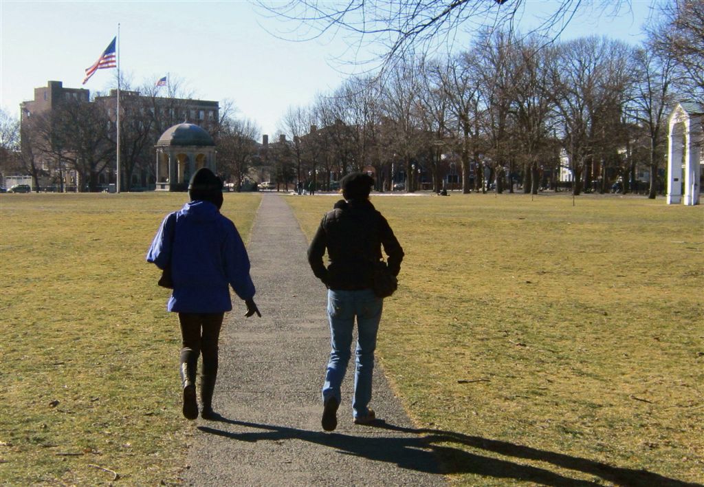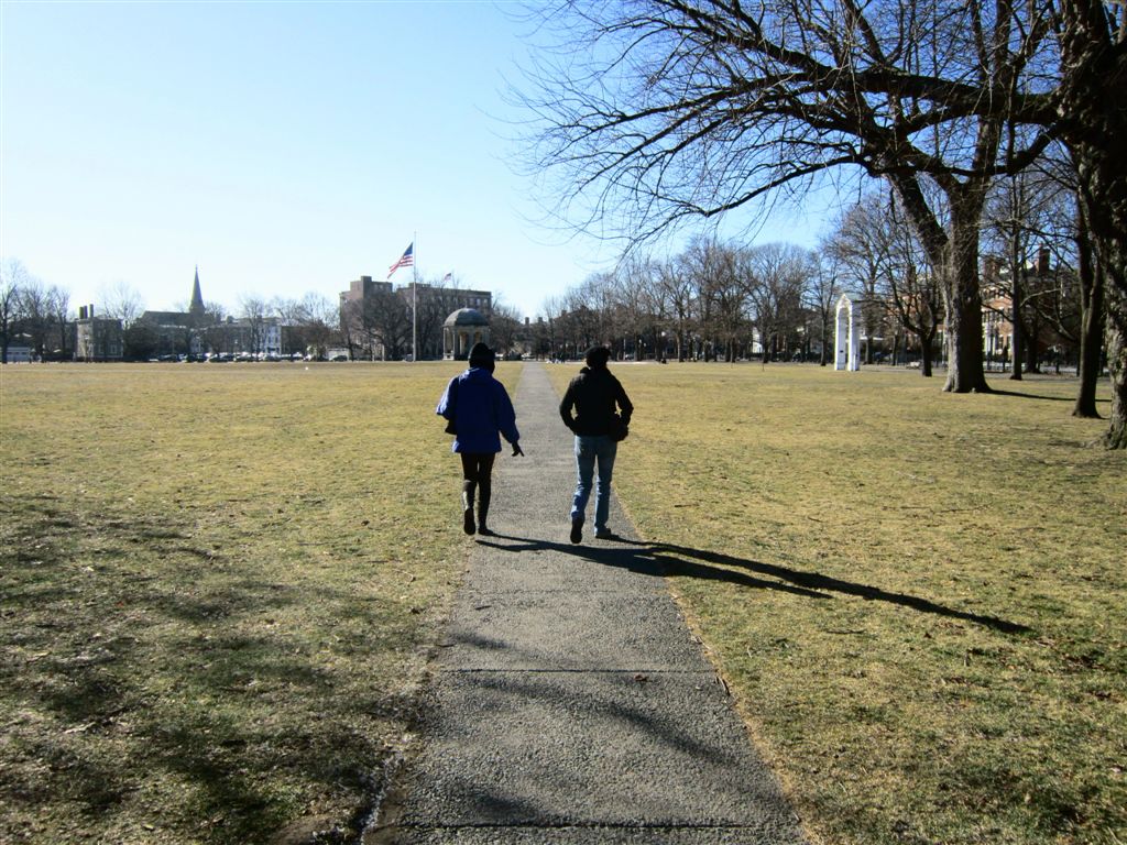 [Approaching the far side of the Common. Our host house is directly across following the side walk. And yes, that is a skating rink on the left side.]