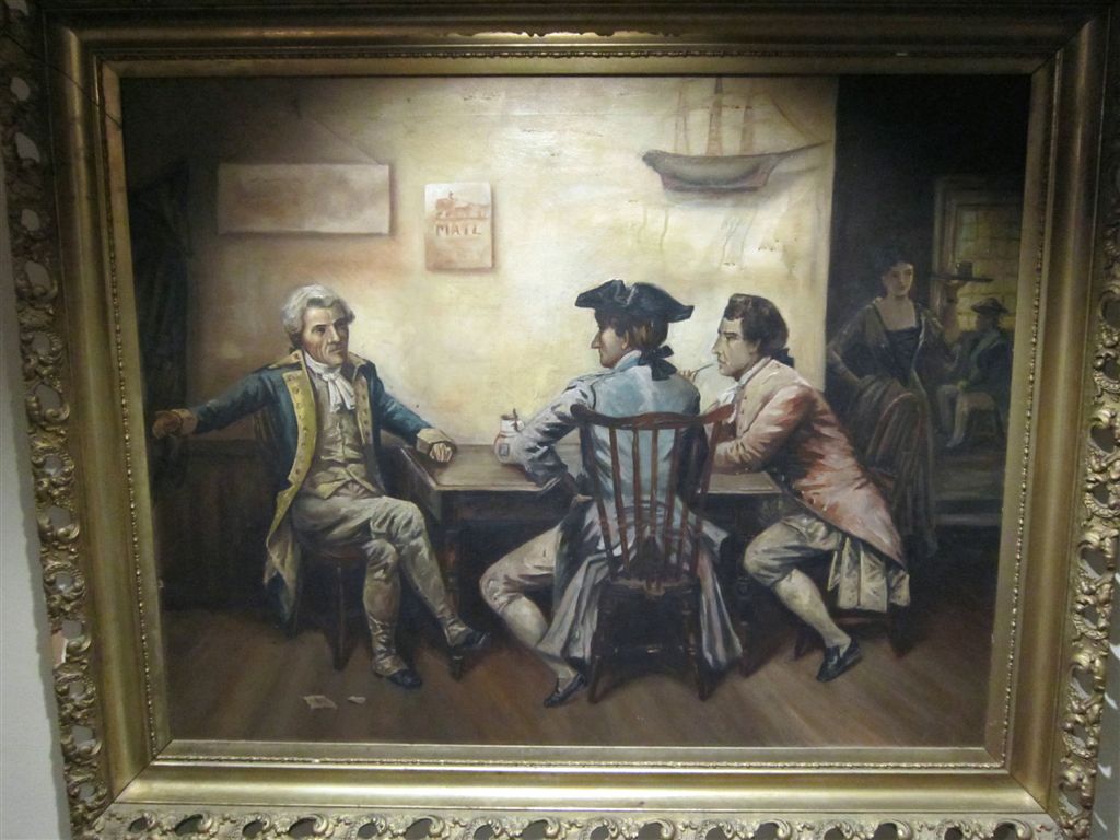 [Finally! The supervisor, adventurer that she is, ordered the “Coow Woow,” which is, of course, America’s first cocktail, consisting of white rum and ginger brandy over ice. I thought I was “local enough” with a Sam Adams.]
