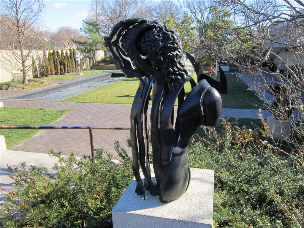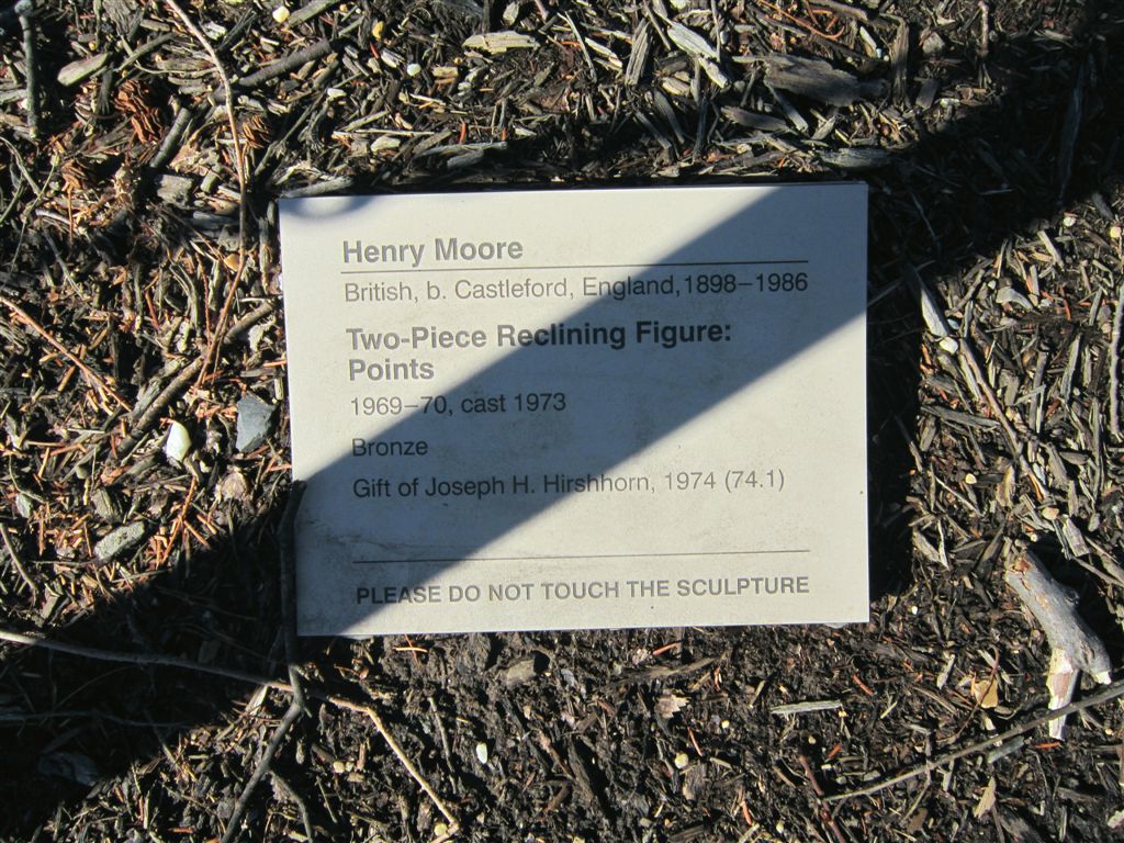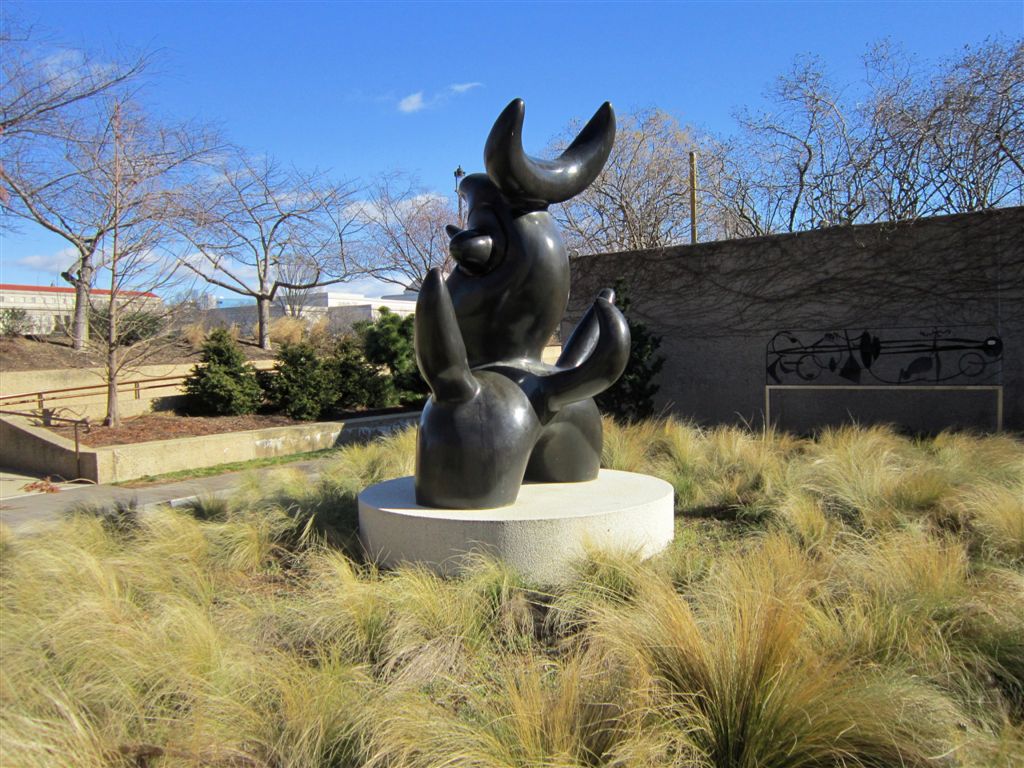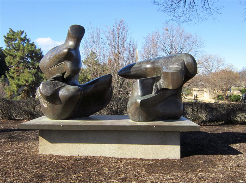 [To escape the biting wind as soon as possible, we sprinted to the Hirshhorn Museum’s Sculpture Garden, which was just off to the left of where I was standing when I took the Washington Monument photo. The “we” now included our D.C. host (yes, we inflected ourselves upon old friends again), Bill (and Anne) Gross. The two statues in this photo are by Henry Moore, whose works are often described as sensual. I concur. 😉 ]