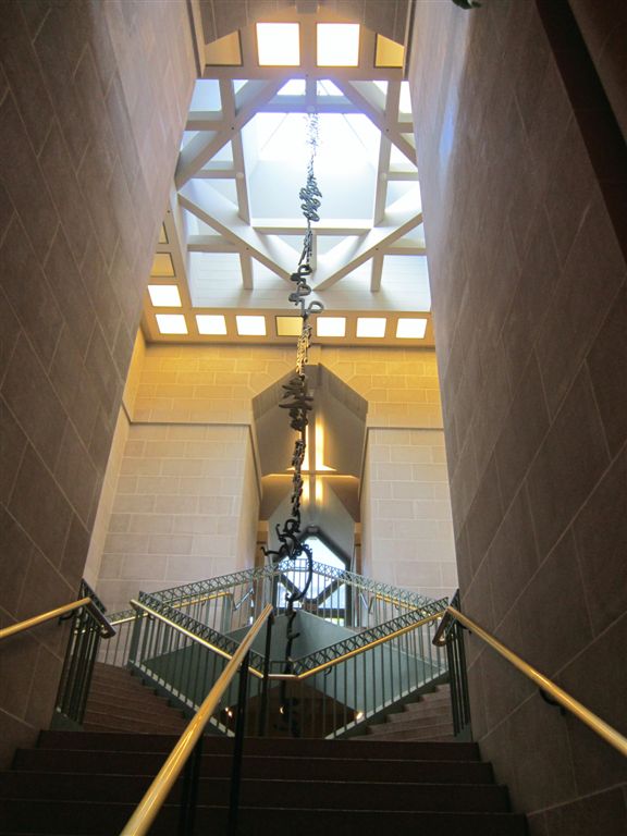 [“Monkeys Grasping for the Moon,” Xu Bing, 2000. 21 interlocking laminated wood pieces that suspend from the skylight to the reflecting pool on the bottom level.]