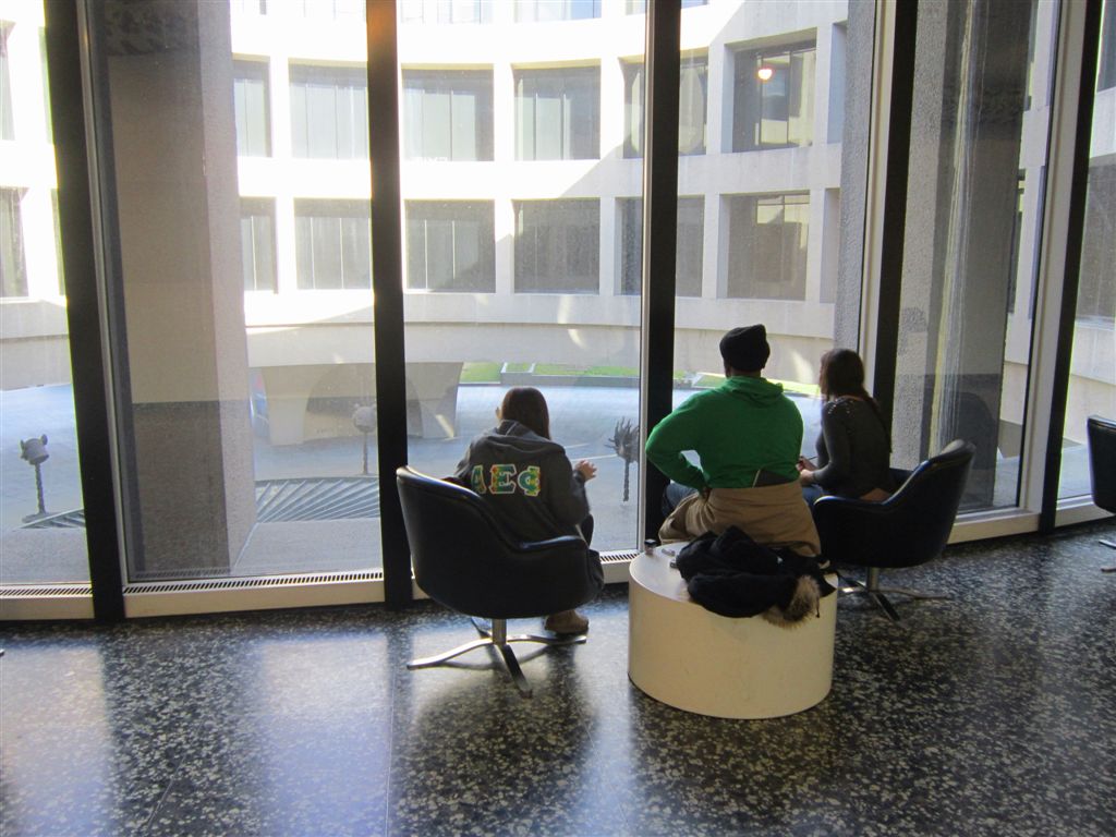 [Art students with their teacher. Drawing stuff in the outside atrium.]
