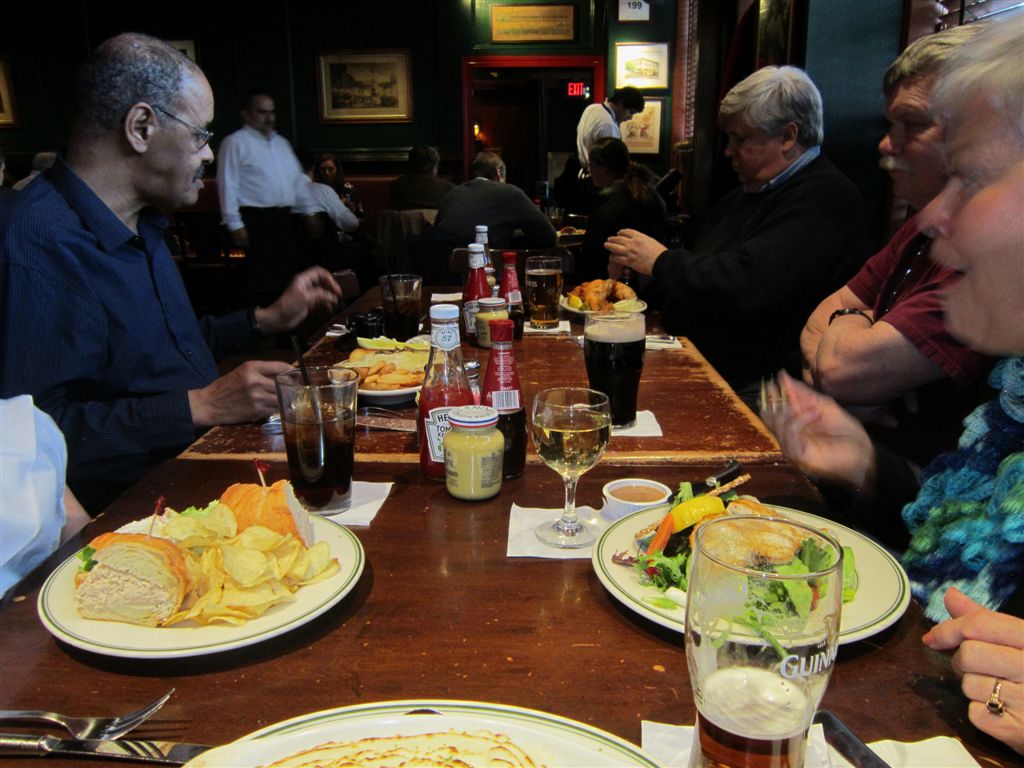 [Meanwhile, earlier that same day, Friday, February 1, those brave enough to venture out in the biting cold of that day, gathered at The Dubliner for an Irish nosh. Pictured here is my brother-in-law, Mohamed Chighali, standing, who dined on the very Irish Philly cheese steak, and Mark Brown, sitting right, who recently retired as, I believe, the equivalent of the CFO for the National Oceanic and Atmospheric Administration, and who, as I recall, dined on the more traditional fish & chips.]