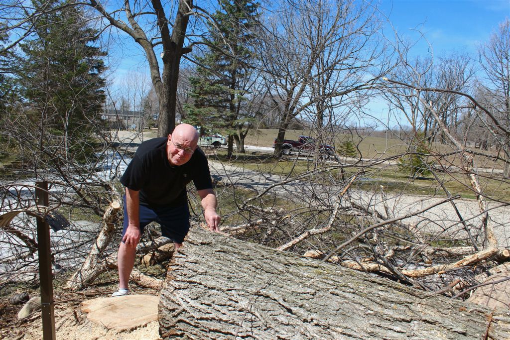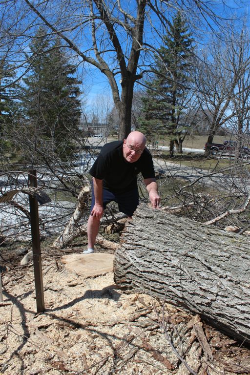 It was a grand old American elm. I have written about it often, for it protected the house’s west flank . . . for 12 years. I always said we’d move if we lost it. It succumbed to Dutch Elm Disease last fall. Today we had “the funeral” – Larry Steidl’s Tree Service came in and brought it to the ground in a little over a half hour. I videoed, for posterity, some of its final minutes: