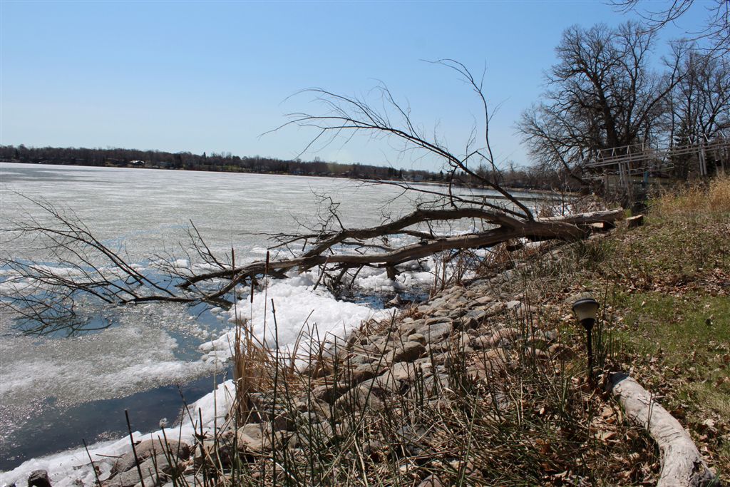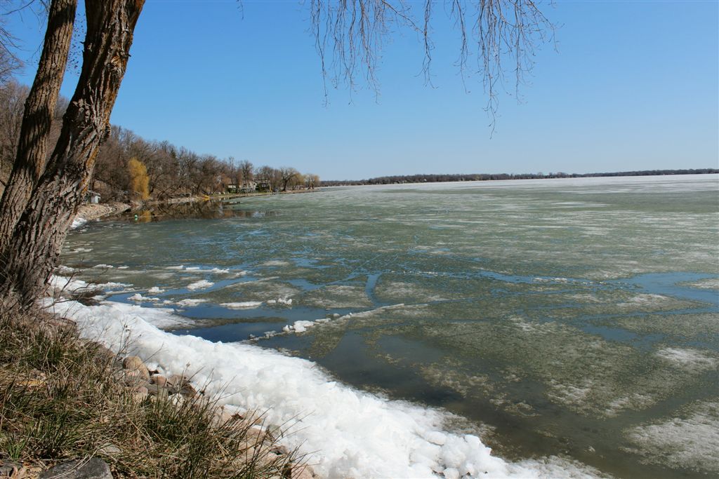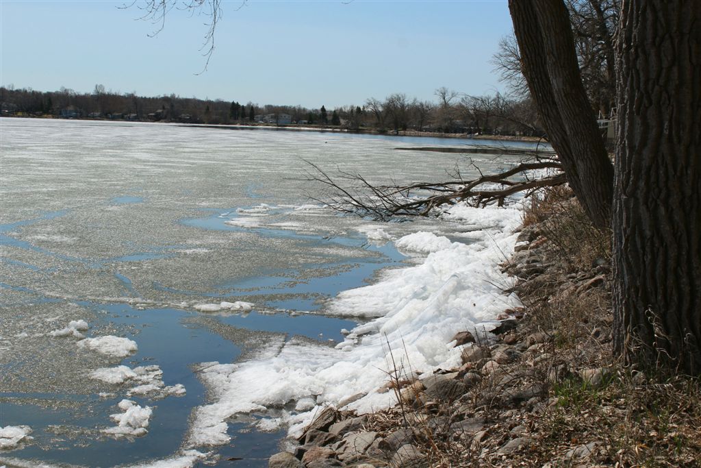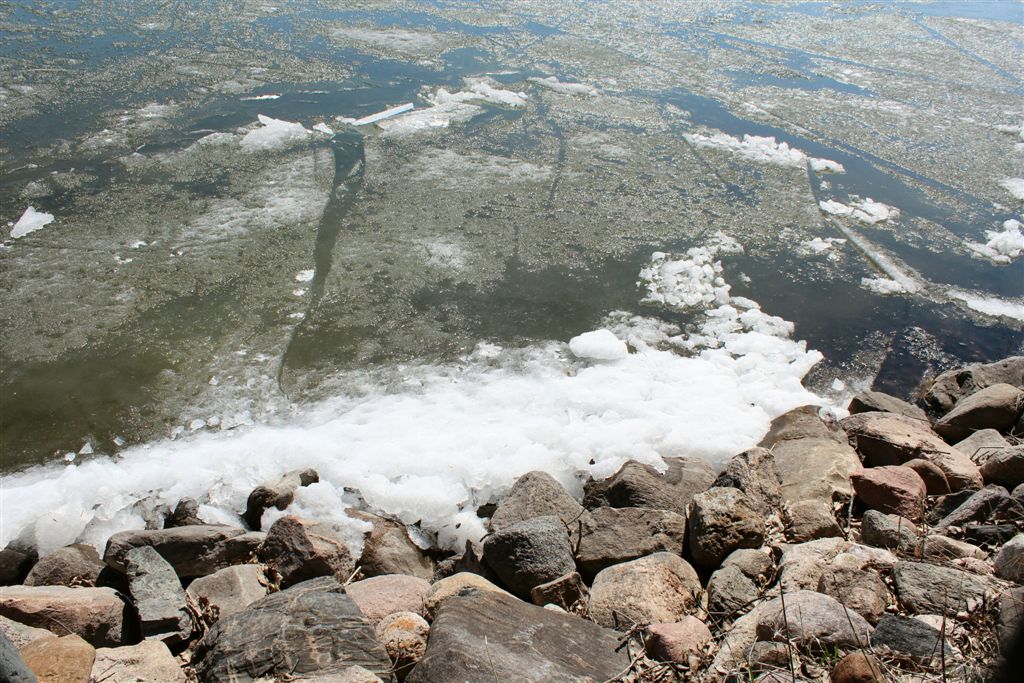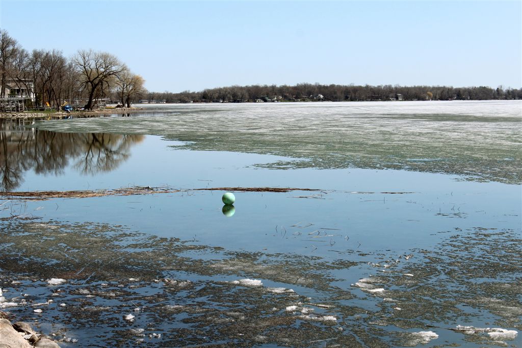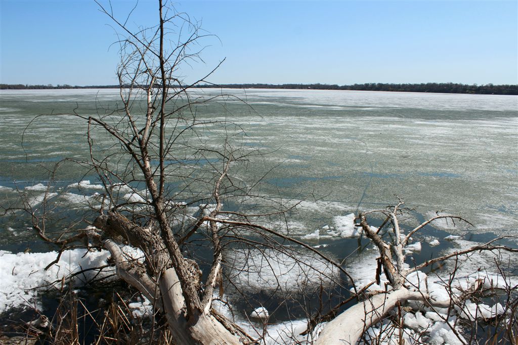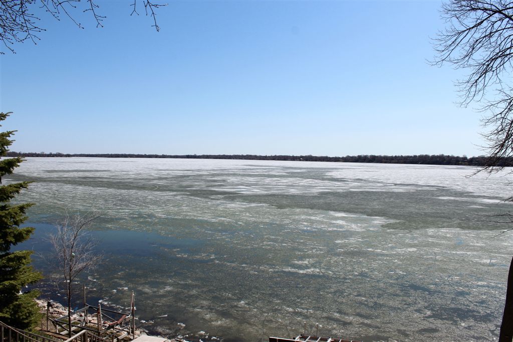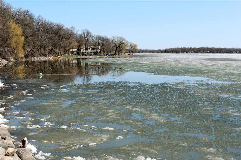 [Looking South, if not ice dams, at least snow dams from the top of the ice. The lake levels appear to be back to “normal,” if not a little above.]