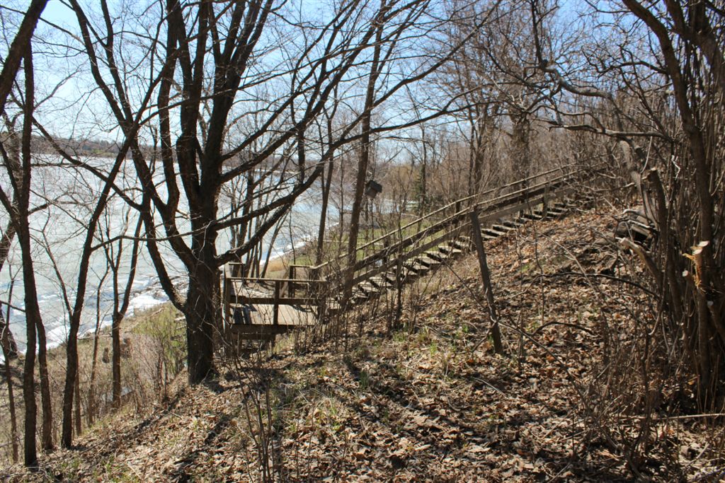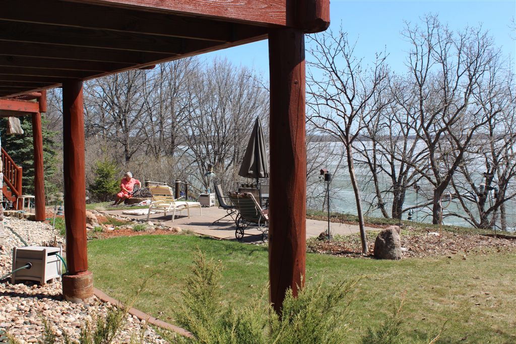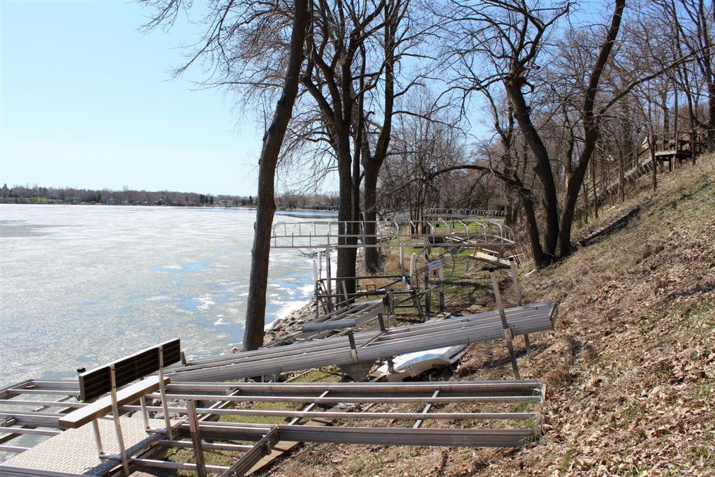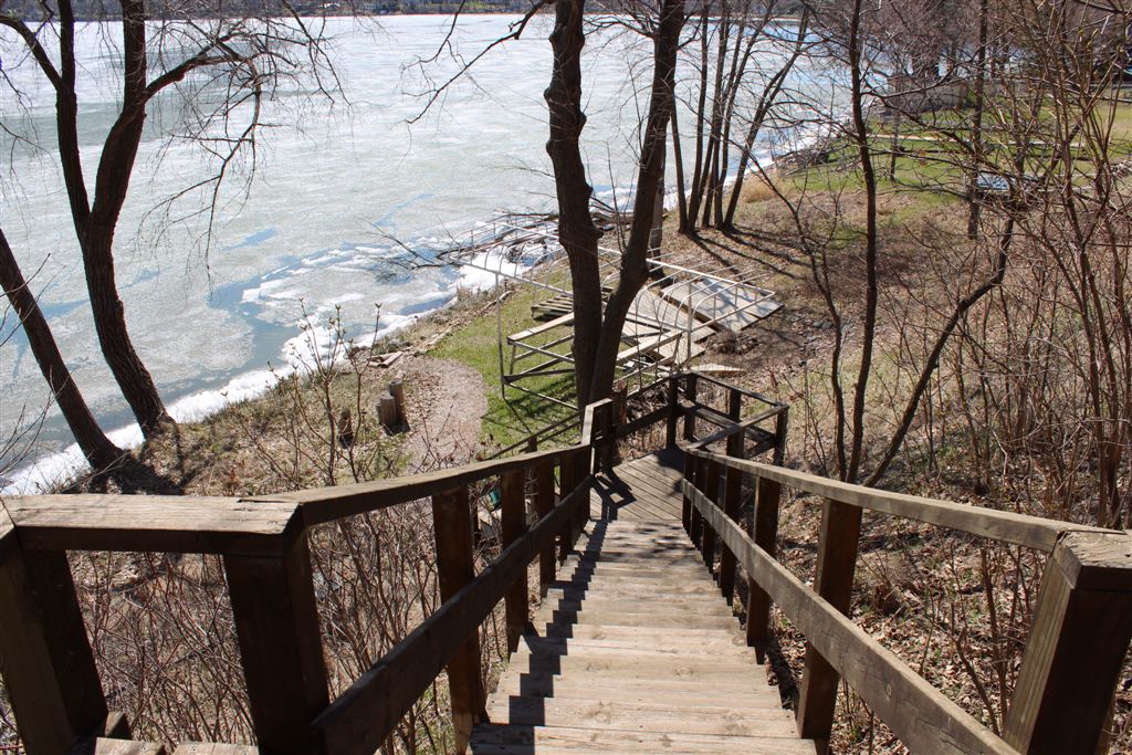[I made it! All the way to the bottom. A sign of the season (?), a beach ball floating in front of Dangerous Dan’s. Between my vantage and the point, there will be at least three lake homes for sale this year.]