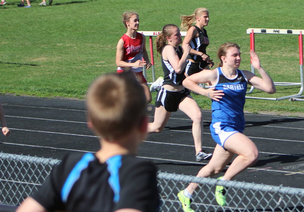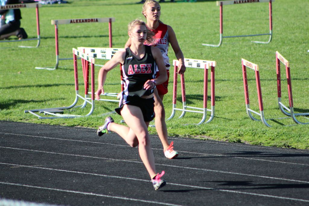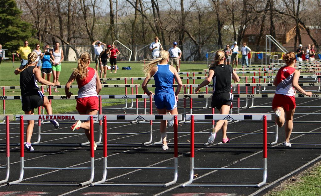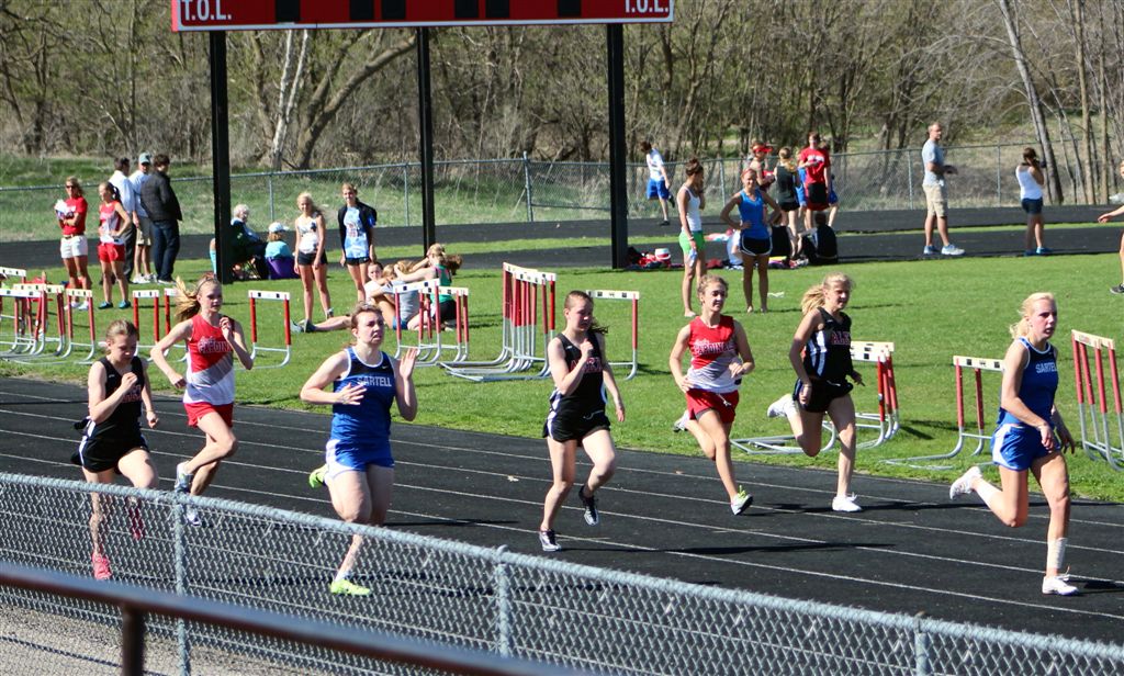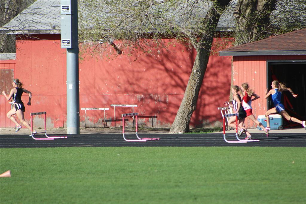 [Karly Betterman, of Cardinal basketball fame, leading the pack of 3 on the right in the 300-meter hurdles.]