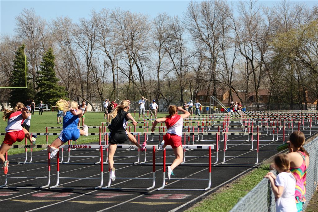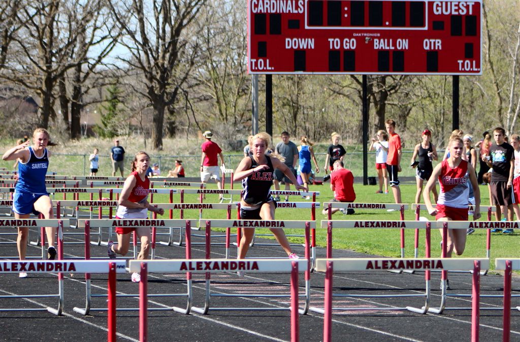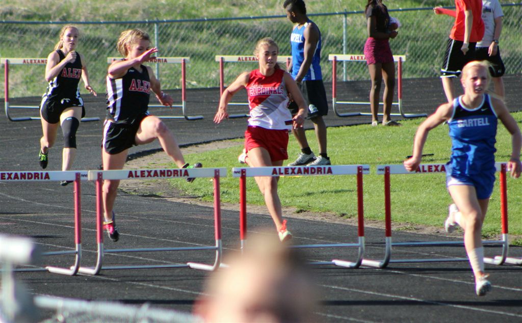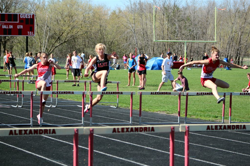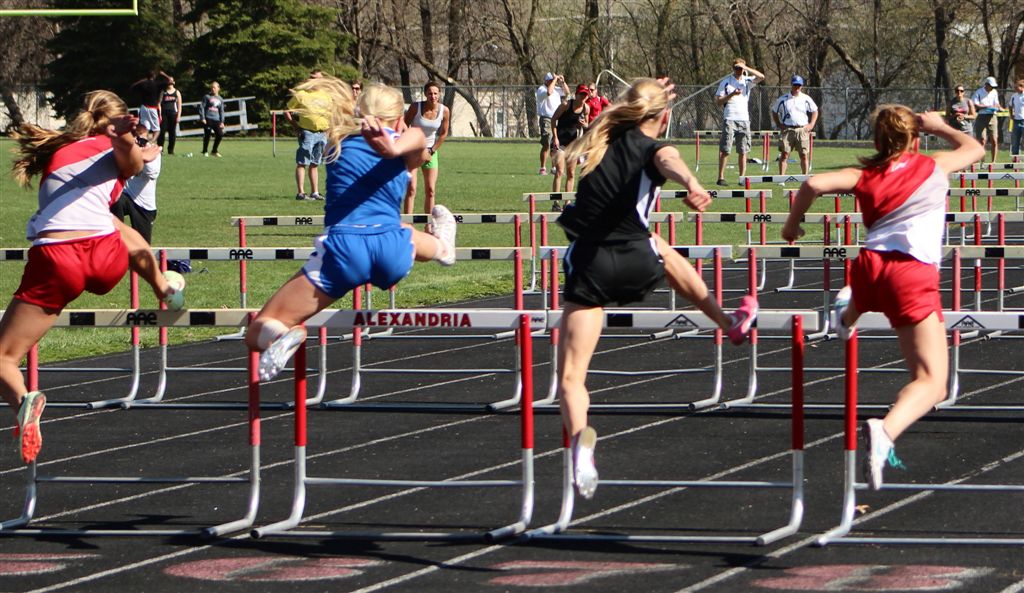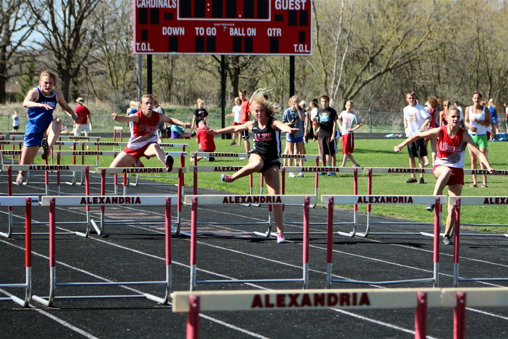 [Karly Betterman, of Cardinal basketball fame, leading the pack of 3 on the right in the 300-meter hurdles.]