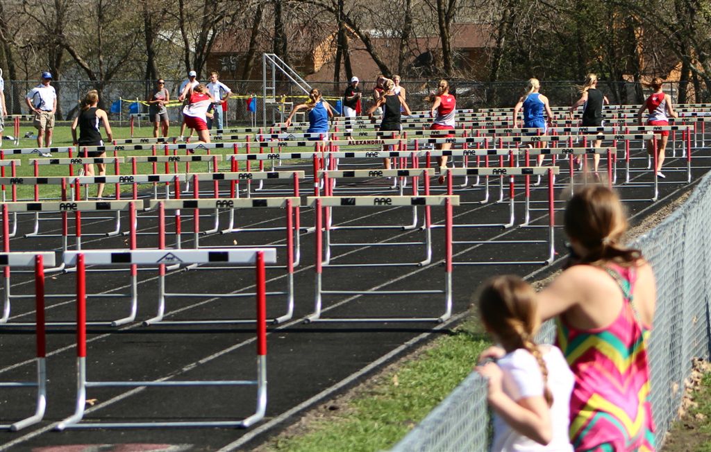 [The temperature was now 93 and the winds were howling. Card tracksters of the future hugged the fence for the beginning heat of the 100-meter hurdles, which would include Becca Illies of Cardinal hockey fame.]