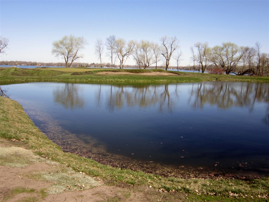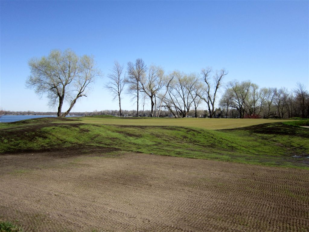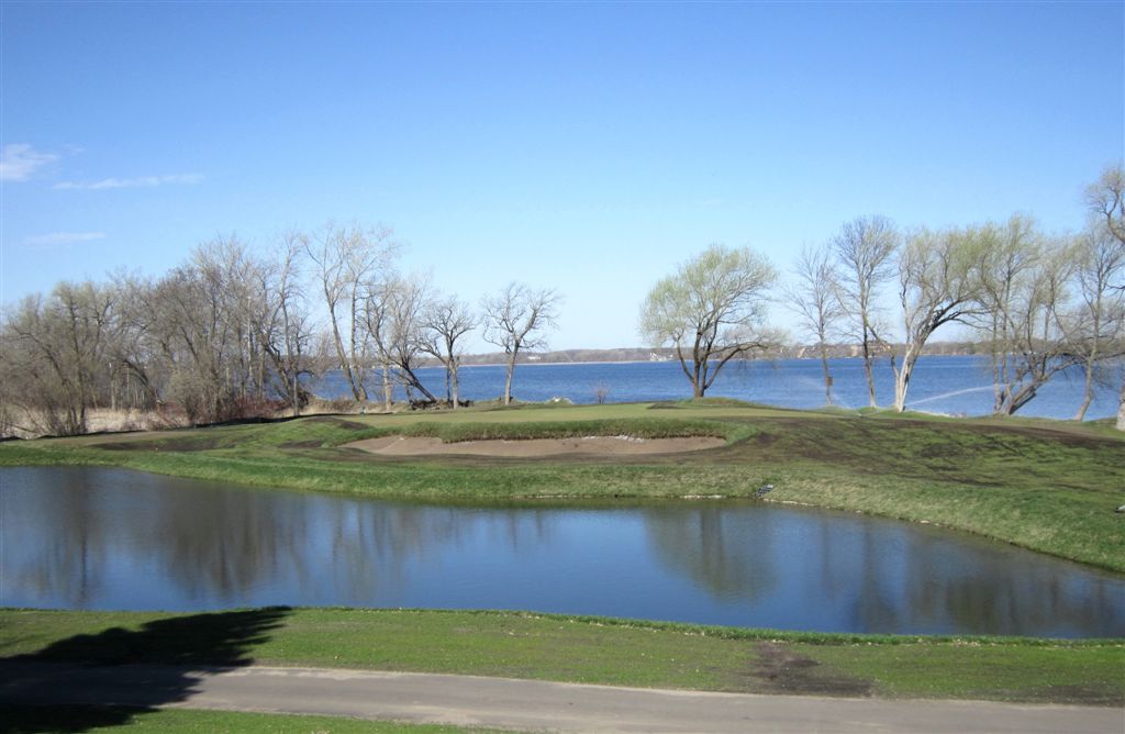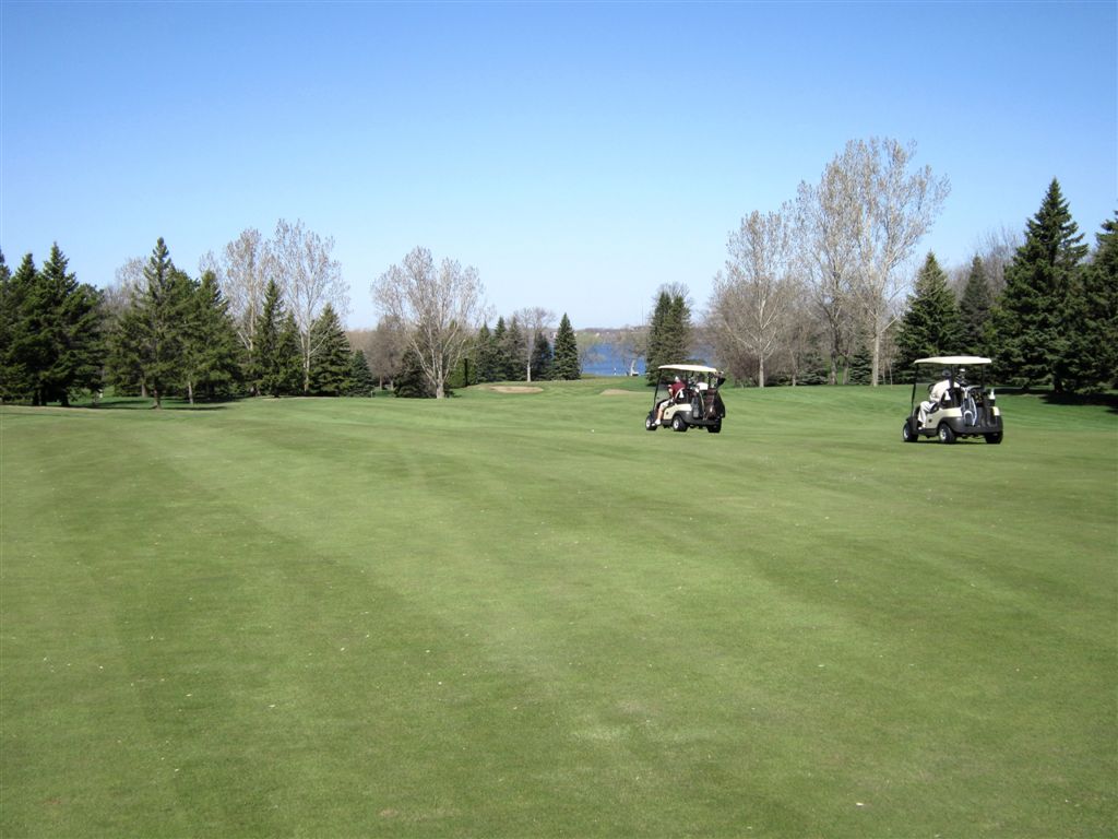 [After the requisite hour and a half jaunt around the track with the Fat Boys, it was off to the golf course. It was starting to green up nicely as we played down No. 6 . . . and Lake Darling now greeted us with blue water instead of white ice.]