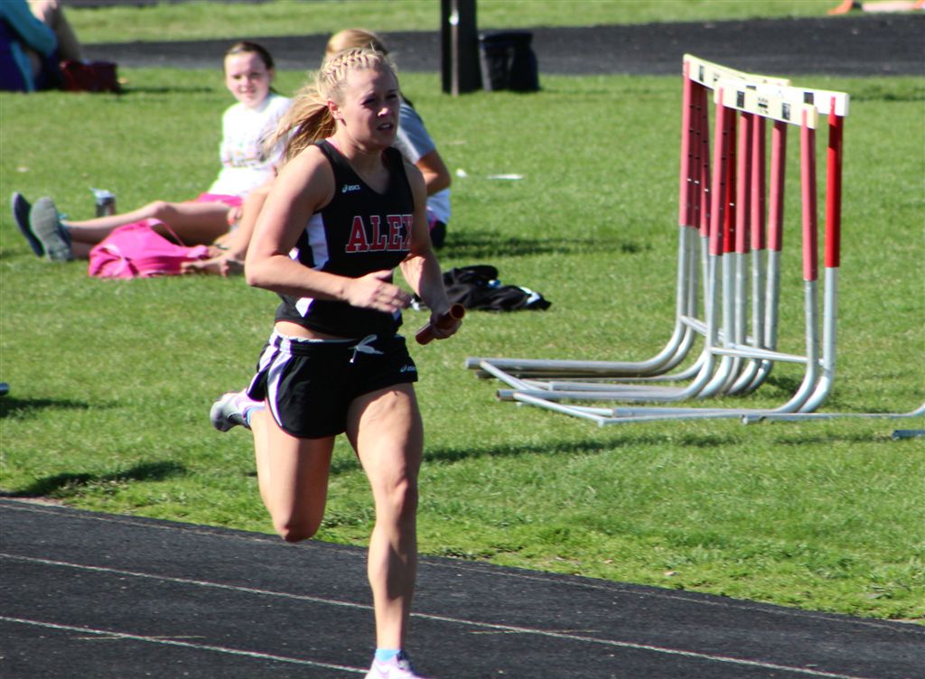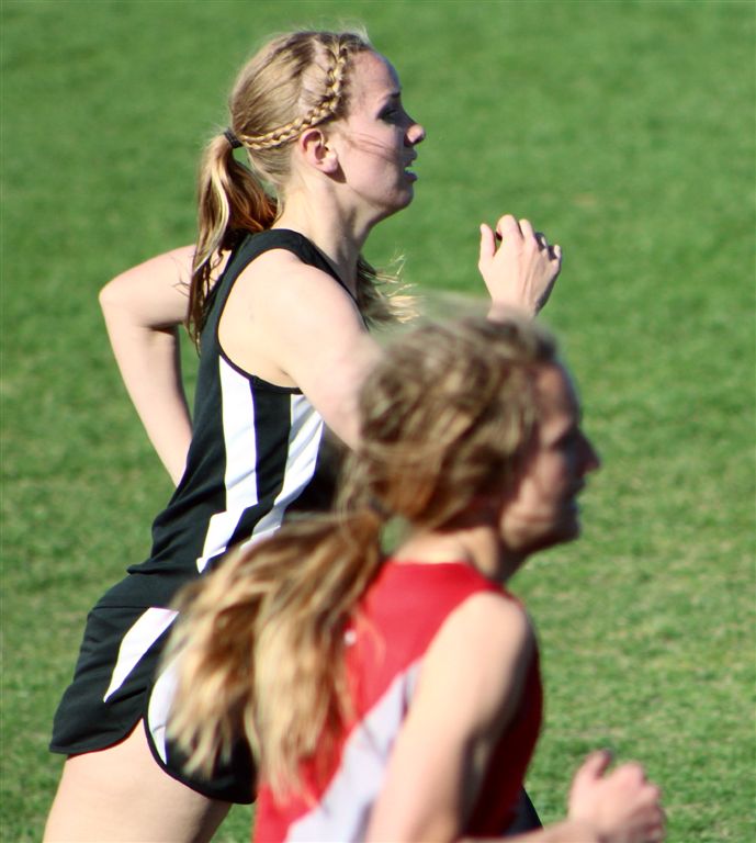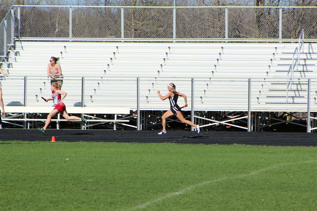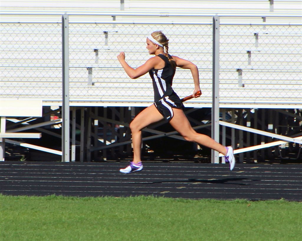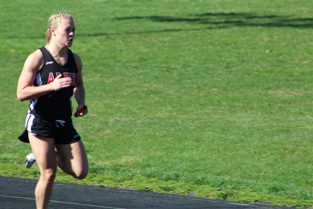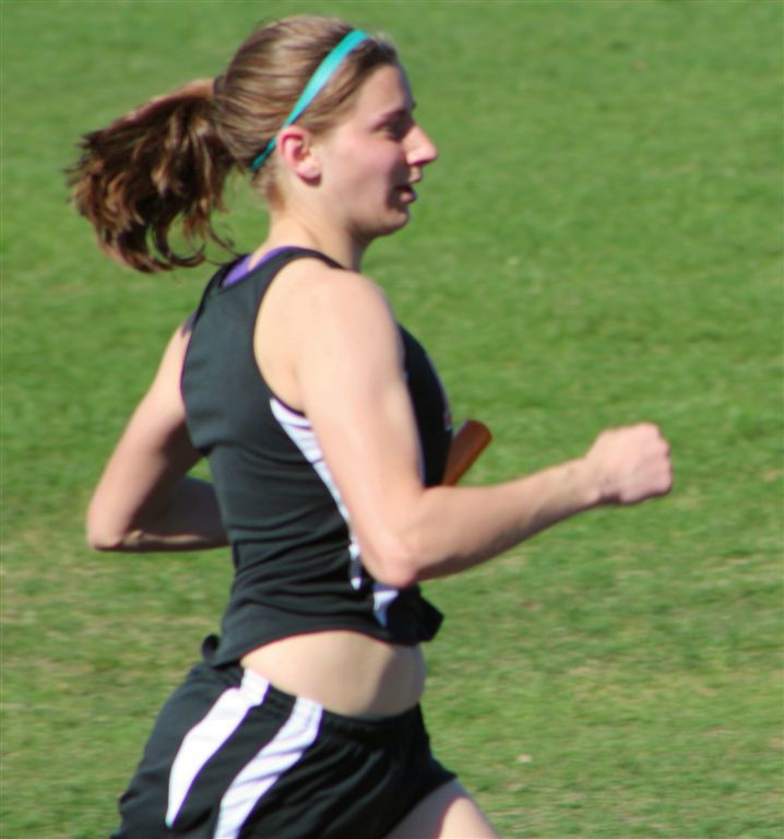 [Here’s Becca on the lead-off leg of the 4 x 200. Did I mention I used up about half my “film” just on the two heats of the 300-meter hurdles? Well, I tend to focus on the athletes I know from other sports. And that’s why there are no boys in this report – besides, it’s mainly about just giving the ladies their due.]