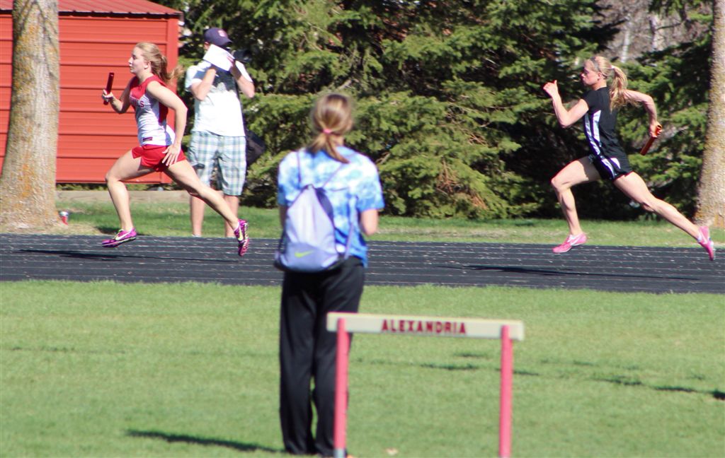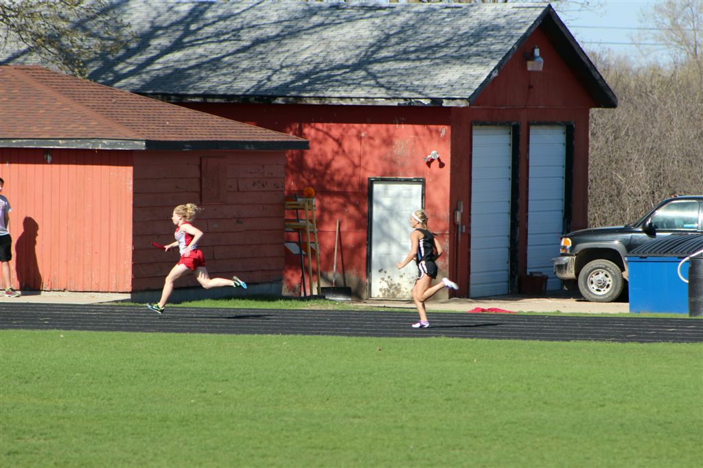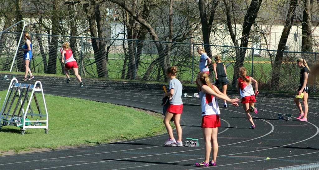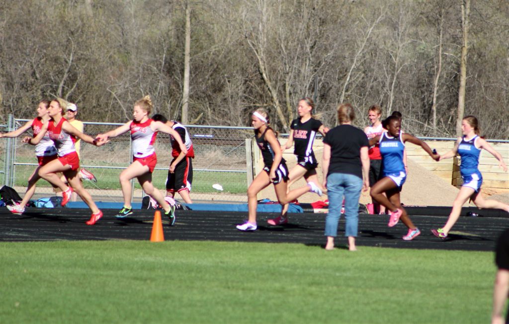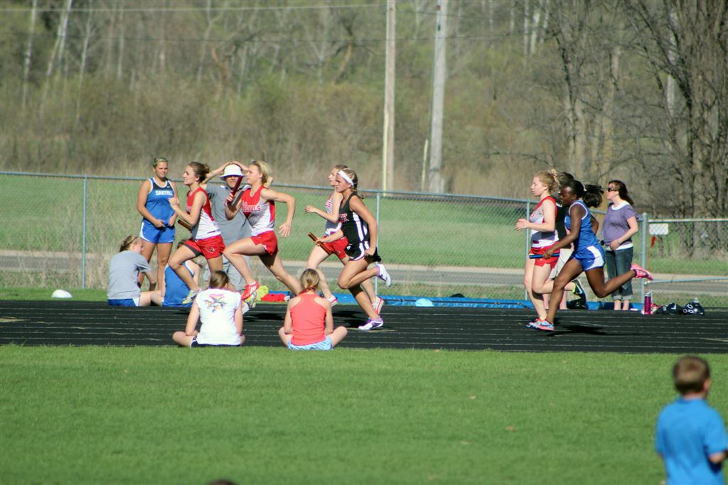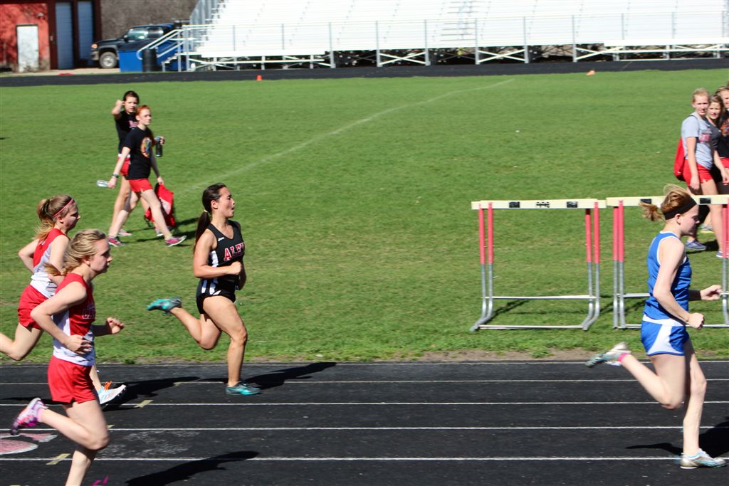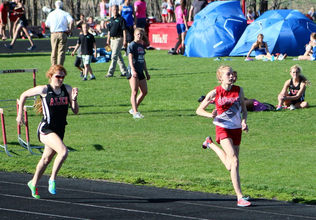 [Here’s Becca on the lead-off leg of the 4 x 200. Did I mention I used up about half my “film” just on the two heats of the 300-meter hurdles? Well, I tend to focus on the athletes I know from other sports. And that’s why there are no boys in this report – besides, it’s mainly about just giving the ladies their due.]