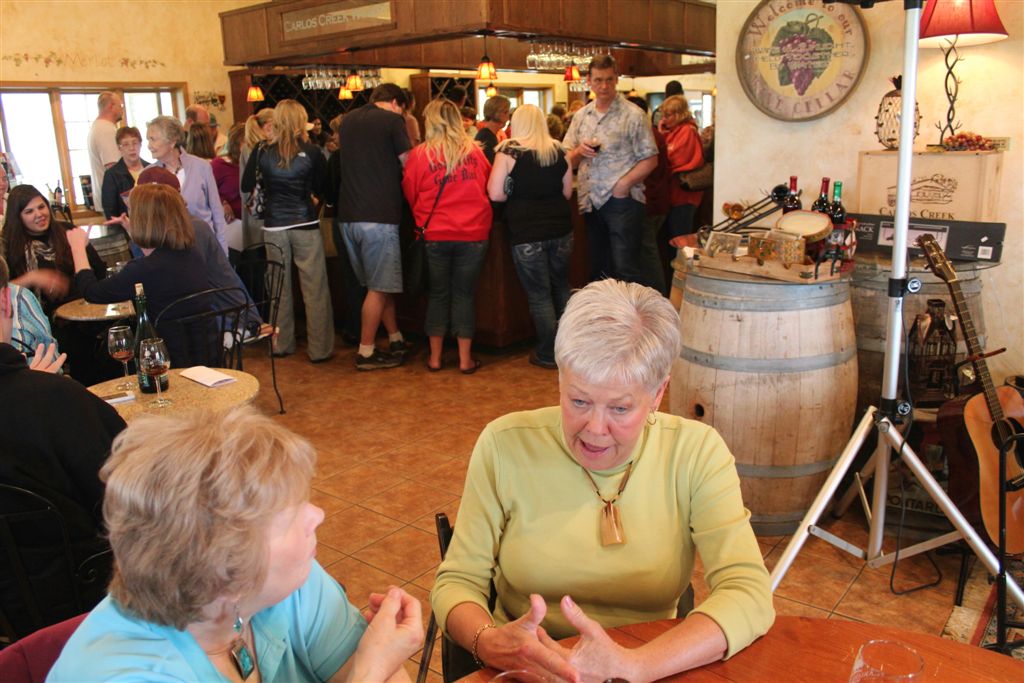 [Jill Moore studies her charts . . . or the wine menu. Although it was noisy, we are happy to report that the group created a whole bunch of new fans as we had a good turnout from the camp social director’s promotional endeavors.]