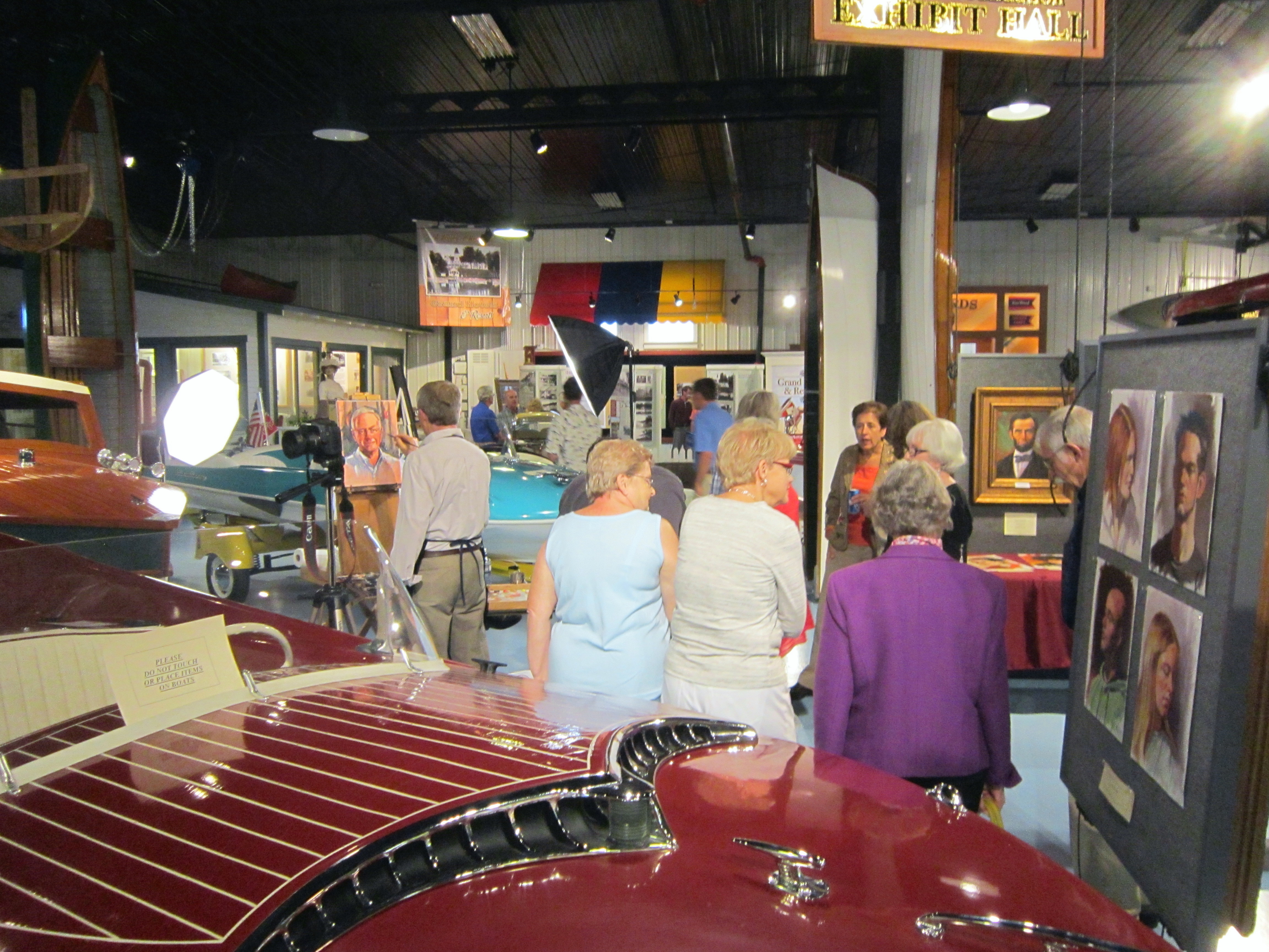 [The supervisor splits two portraits by Myron Sahlberg, as he works on another in the background.]