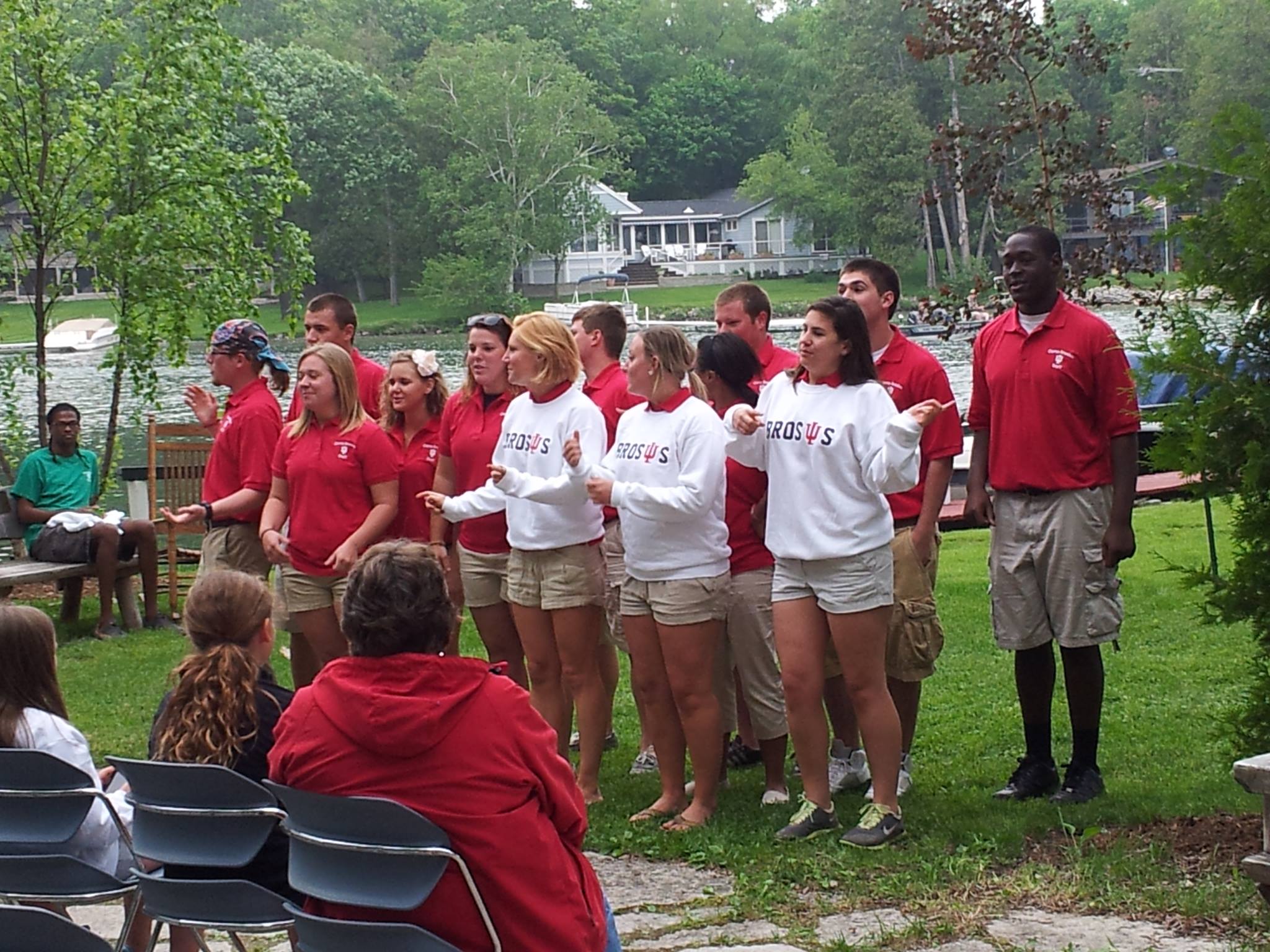 [This week at Camp Brosius, the Indiana University alumni camp in Elkhart Lake, Wisconsin. Grandson Tom, in the tie-dye bandana on the left, having just completed his freshman year at Purdue, is a staff counselor this summer . . . though Purdue and IU are known to be dreaded rivals! 😉 ]