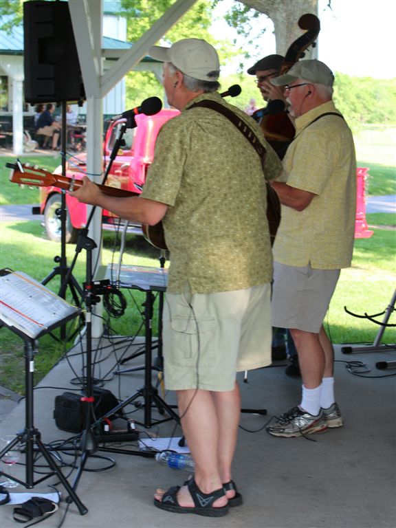 [After Josie’s afternoon performance, Lisa Lynn made her usual end-of-the-month appearance at SAWA. This time she made a bunch of new fans from Camp Ballentine. Lisa looked lovely in what I can only best describe as a summery, Dorothy Lamour-style dress (well, I don’t do fashion, as the supervisor will readily attest). When she arrived, many roadies volunteered to schlepp her stuff. Dave Berg was there because I had given him the wrong Lisa start time, but then he and I and “His Worship” were able to assist Lisa’s pre-performance hefting activities. I can only hope we didn’t violate any union codicils.]