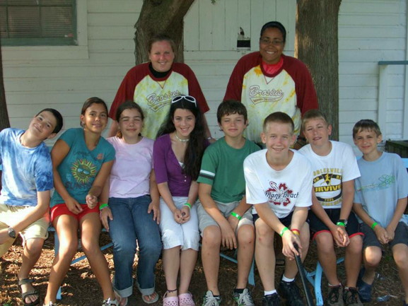 [We’re approaching camp time – when we pack up for a week at Camp Brosius in Elkhart Lake, Wisconsin. Grandson Tom has completed his freshman year at Purdue and is spending his summer as a camp counselor. A review of family archives turned up this photo of Tom from we believe 7 or 8 years ago. He’s 2nd from the right. His annual camp friend Karina is in the middle in the purple. She is a year younger than Tom. In this photo, she appears to be several years older than him. It’s a boy-girl thing.