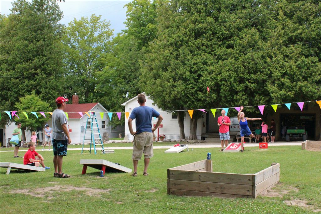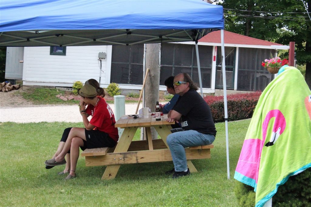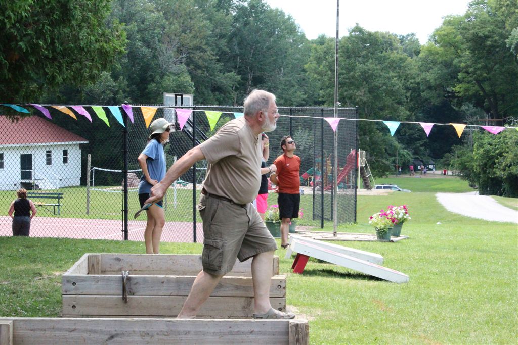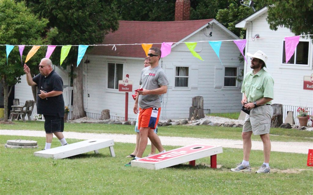Let the games begin! First up, cornhole! My old canoe partner, DOM (the man in black) fires a bag at the offending hole on the other side of the pitch. I decided to sit and watch this year . . . well, because someone had to keep an eye on the beer cooler.