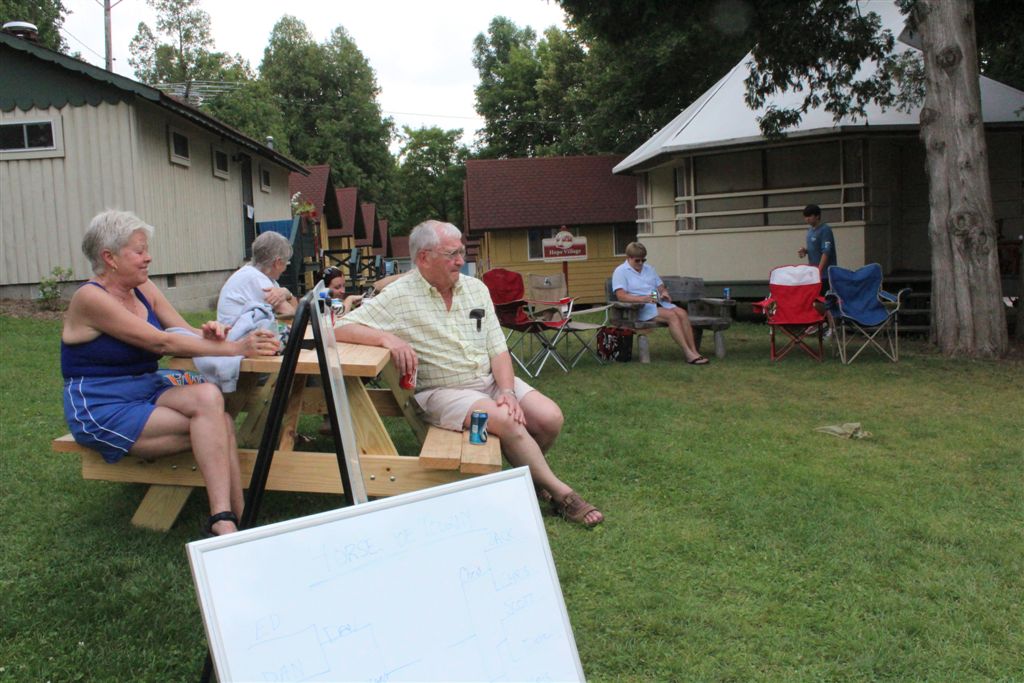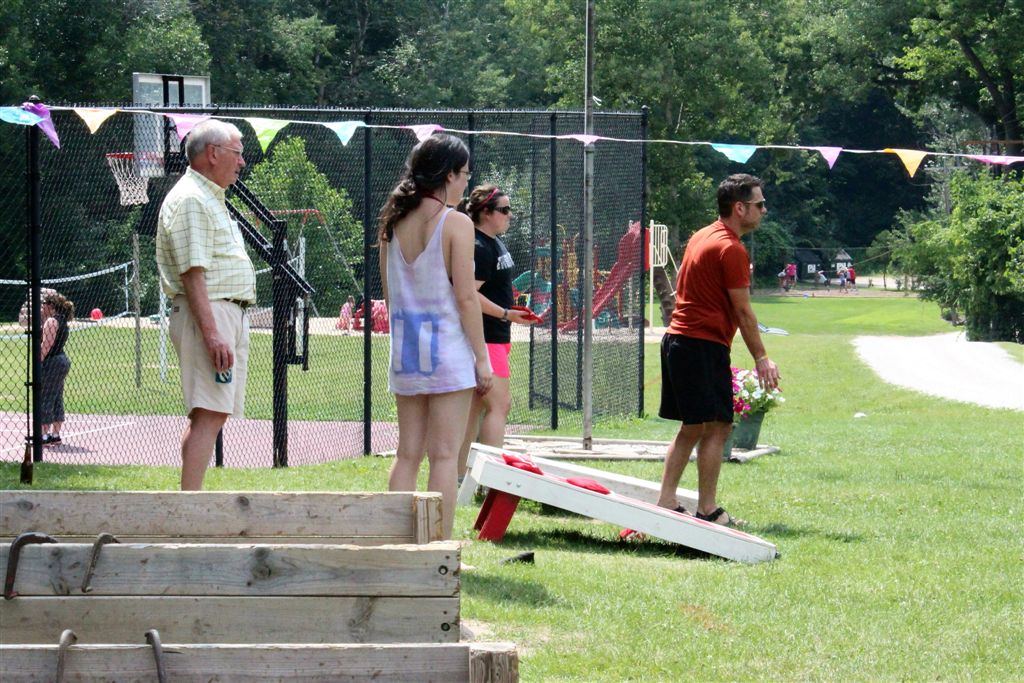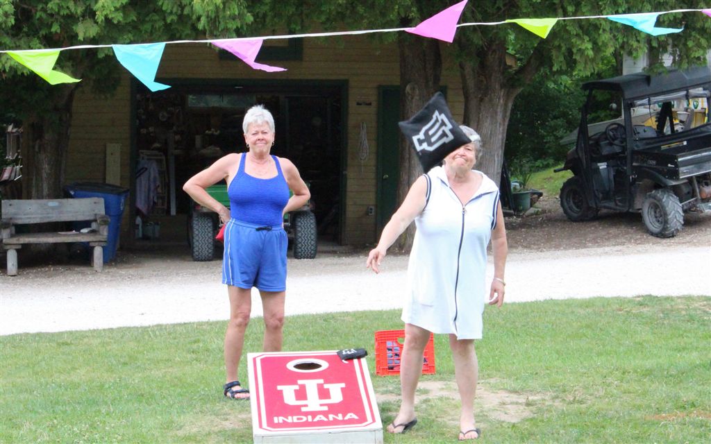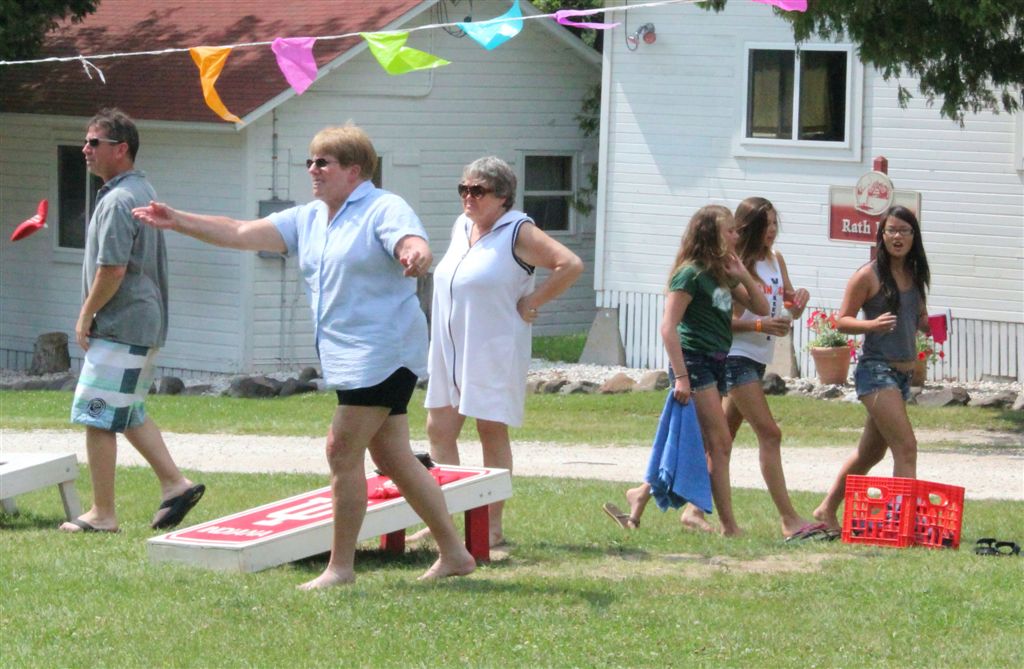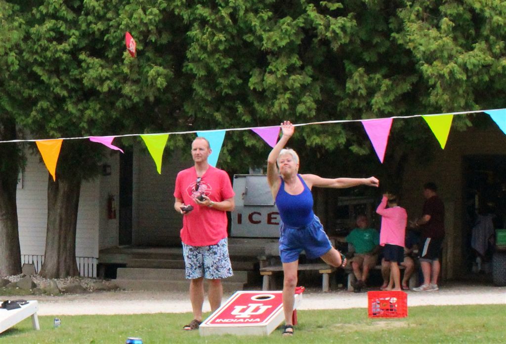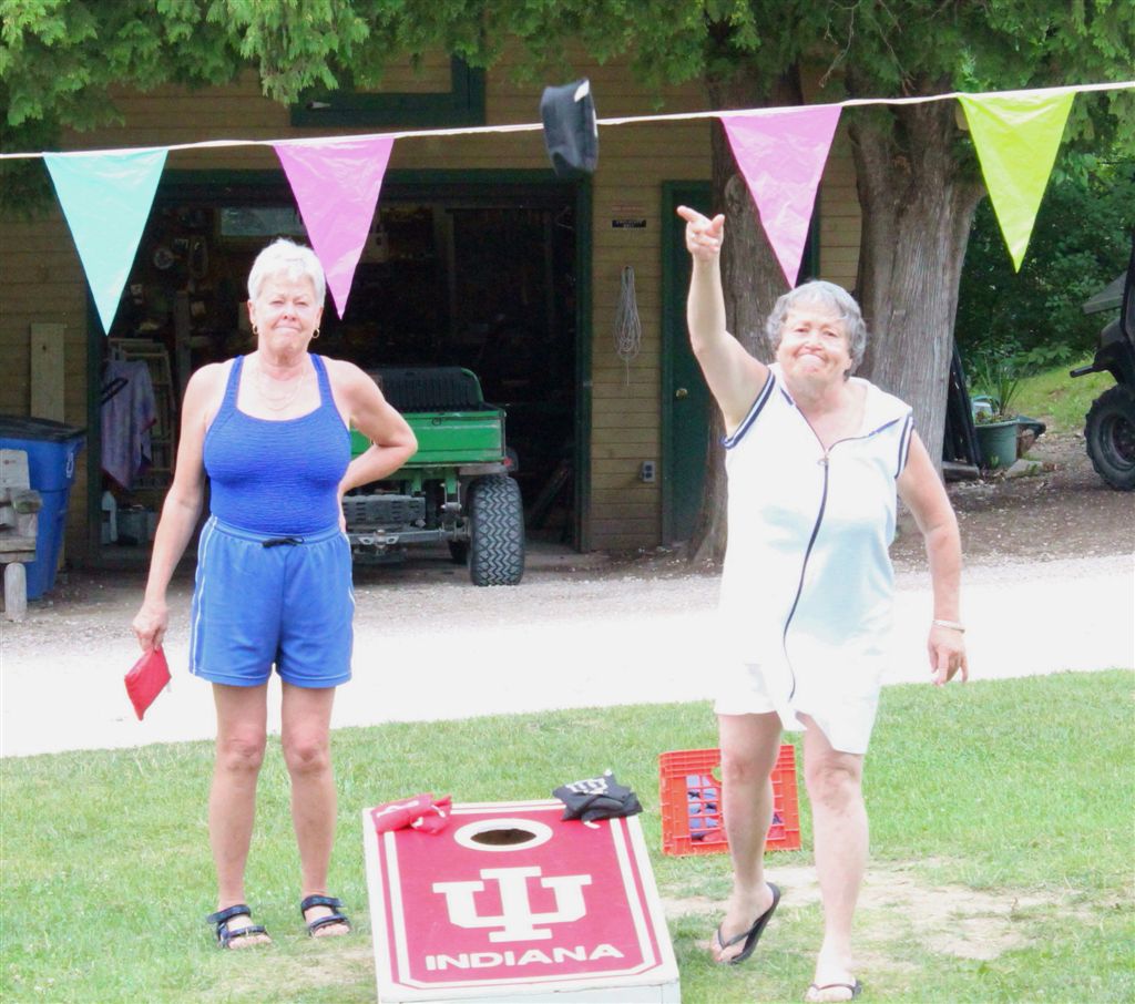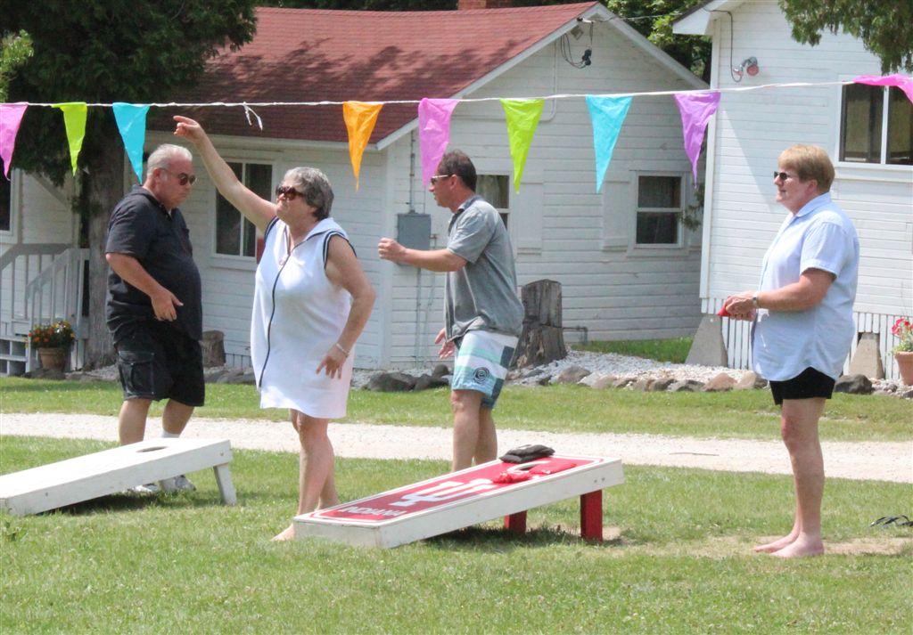 Mrs. DOM in the cornhole tournament, taking on Rita. Tom’s Voyager group wanders by in the background, showing not the slightest interest in the old people goings-on.