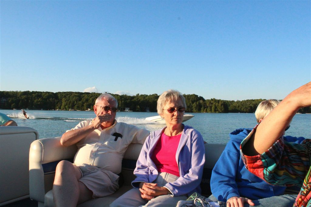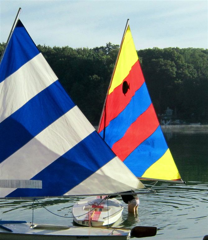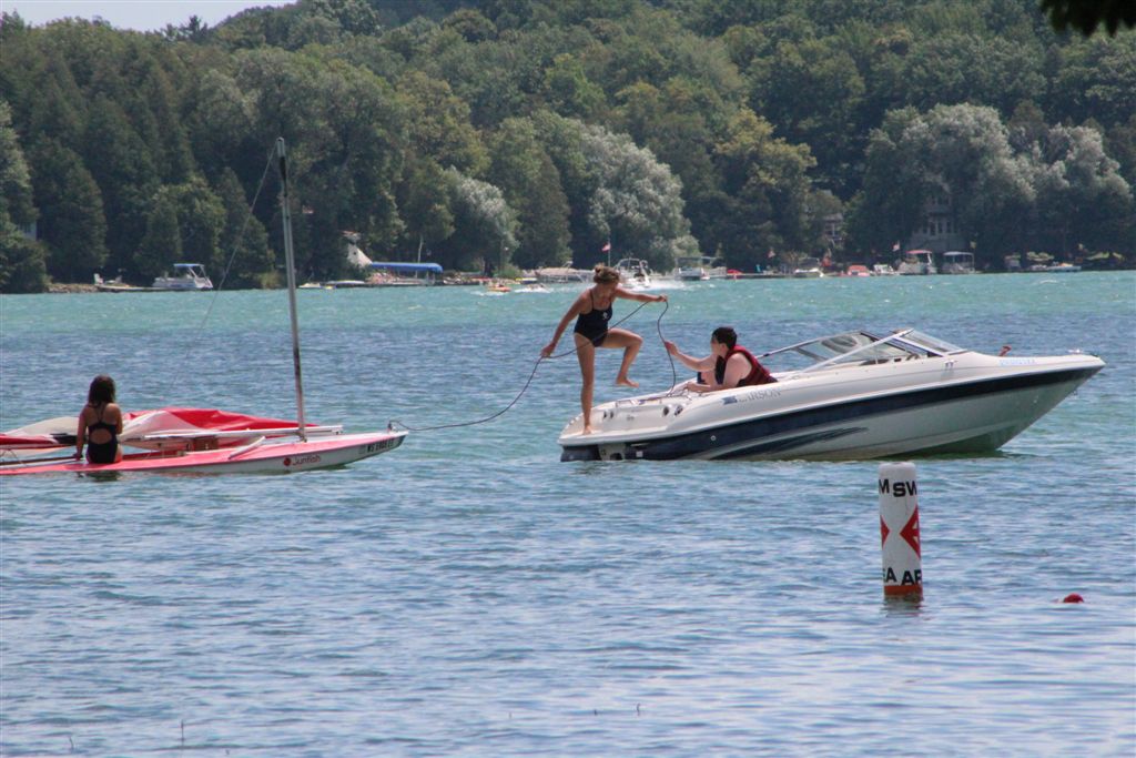 [Karina and friend are safely ensconced in the back of the speedboat as their Sunfish is towed in.]