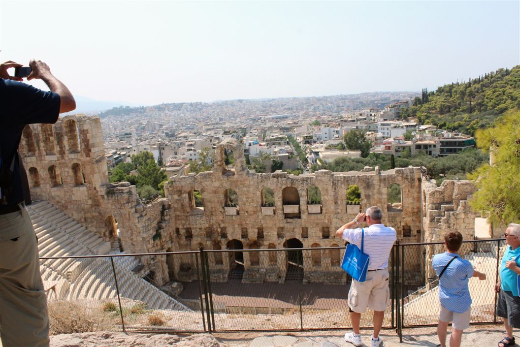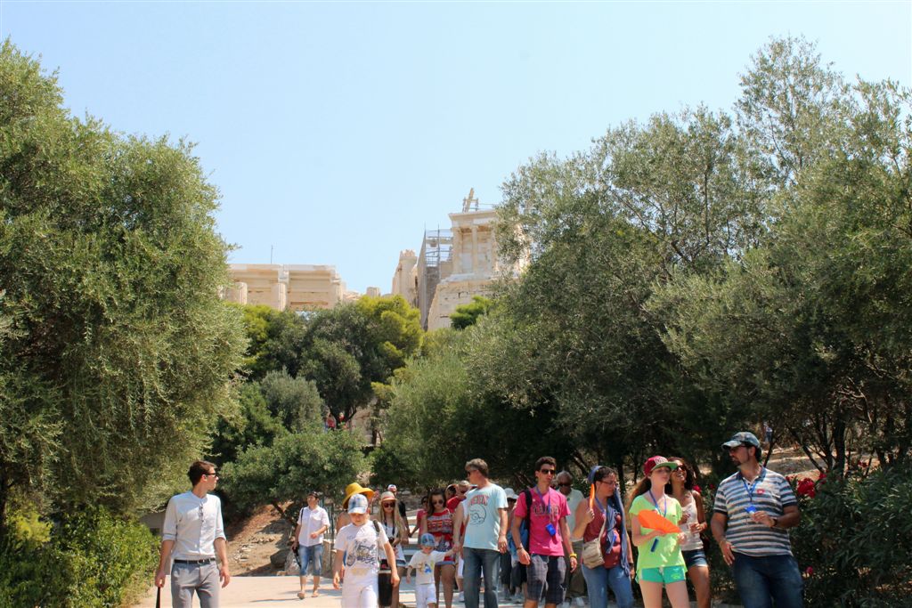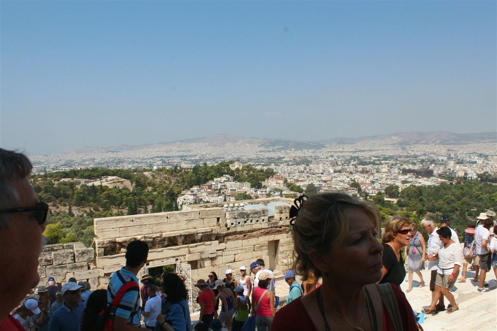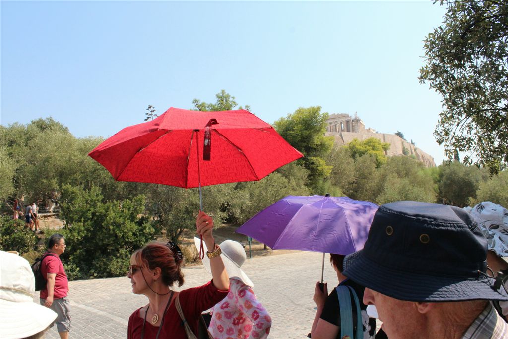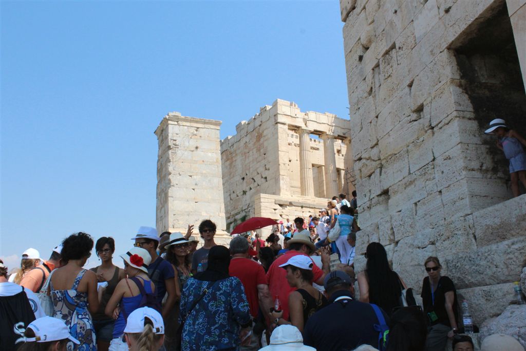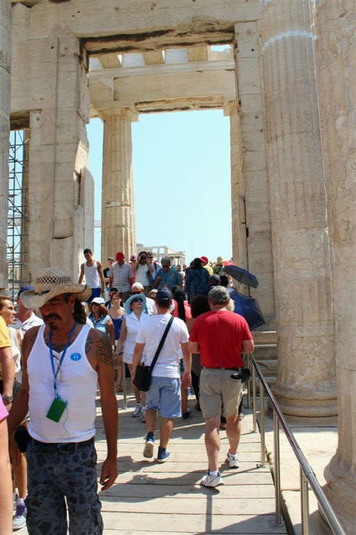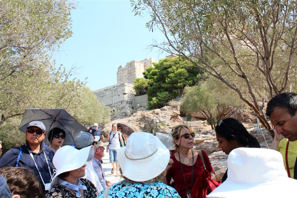[Christiana rounds us up for an assault on the Acropolis. It’s billed as 80 steps up – that excludes the 100’s of feet of sloping walkways! Maybe if it was about 40 degrees cooler!]