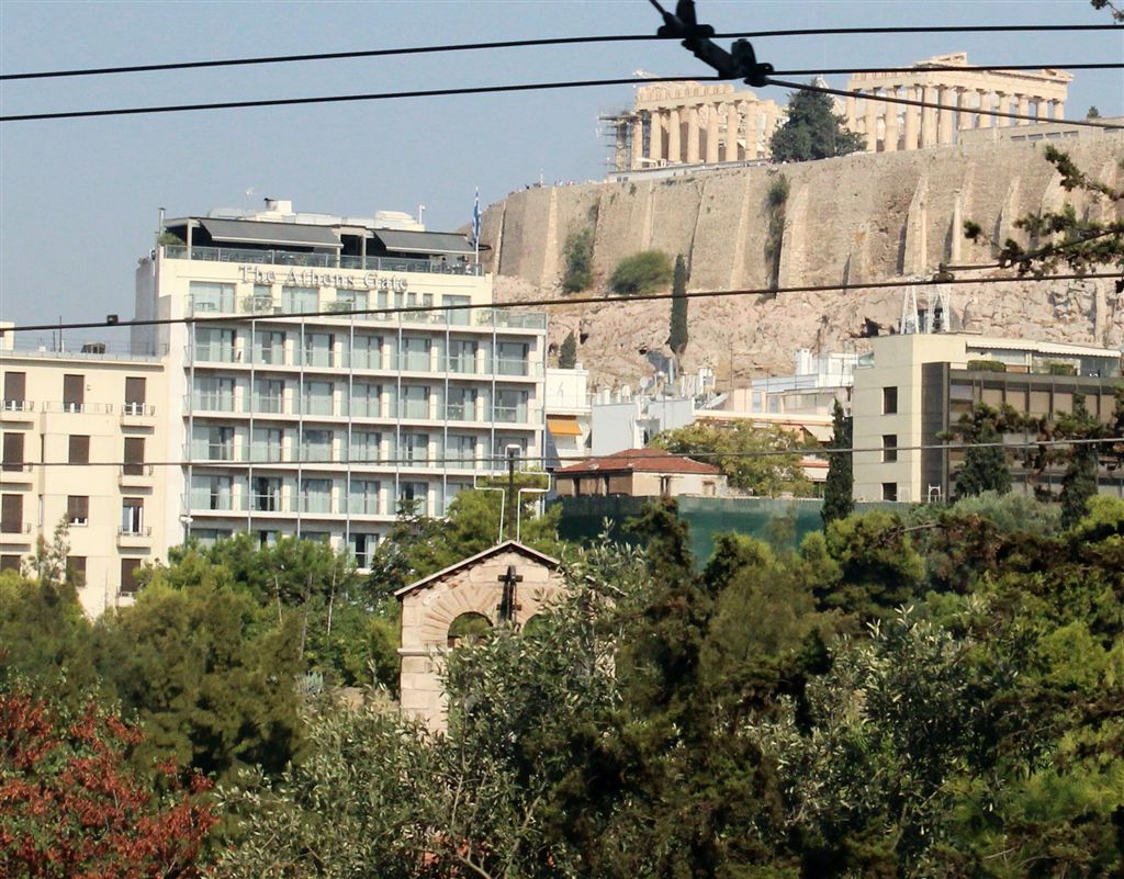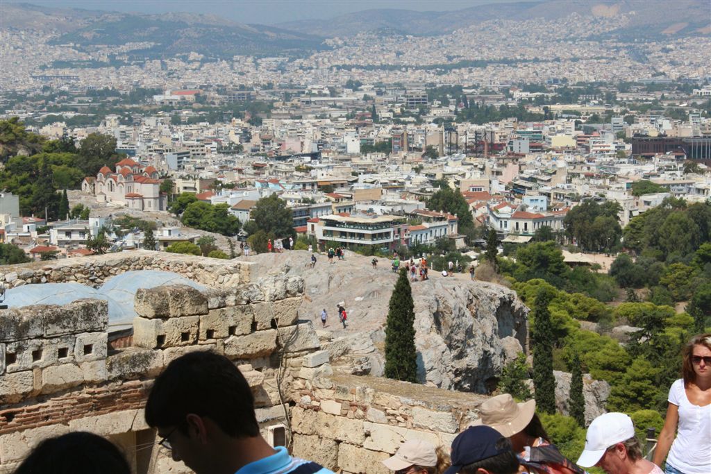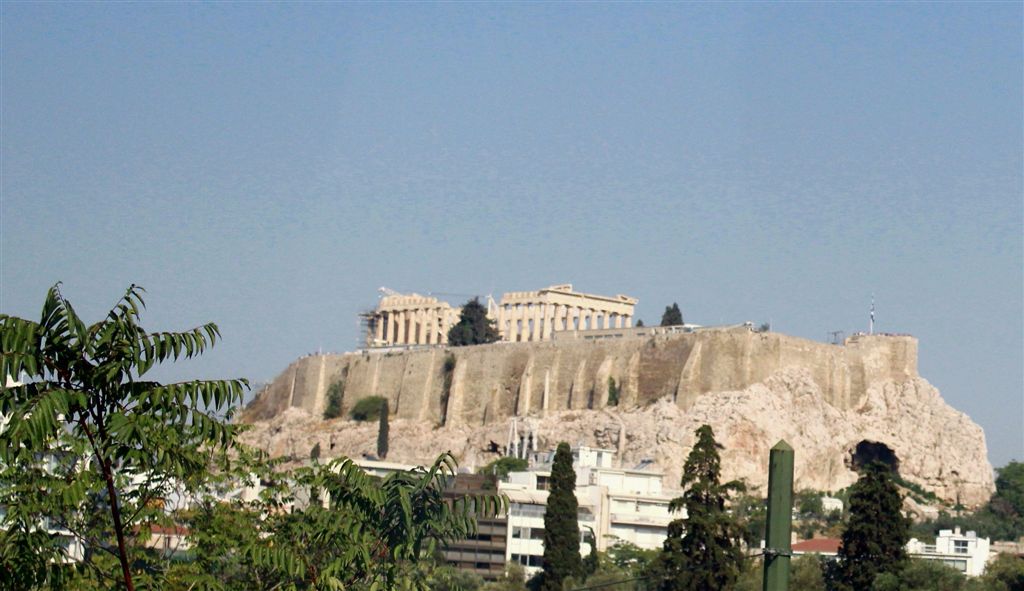 [Our first sighting of the Acropolis. Not an attractive photo but just wanted to show the difficulty of shooting from a moving vehicle. So many of the places we visited, the antiquity involved looking through modernity, which meant power and communications lines. 😦 ]