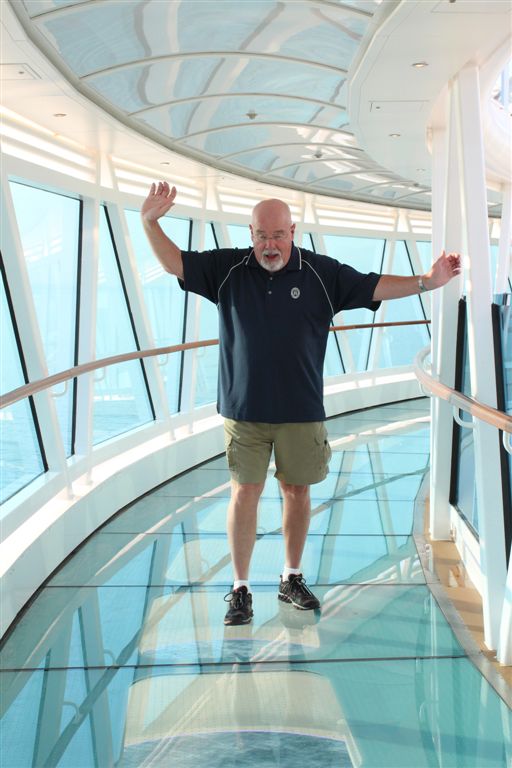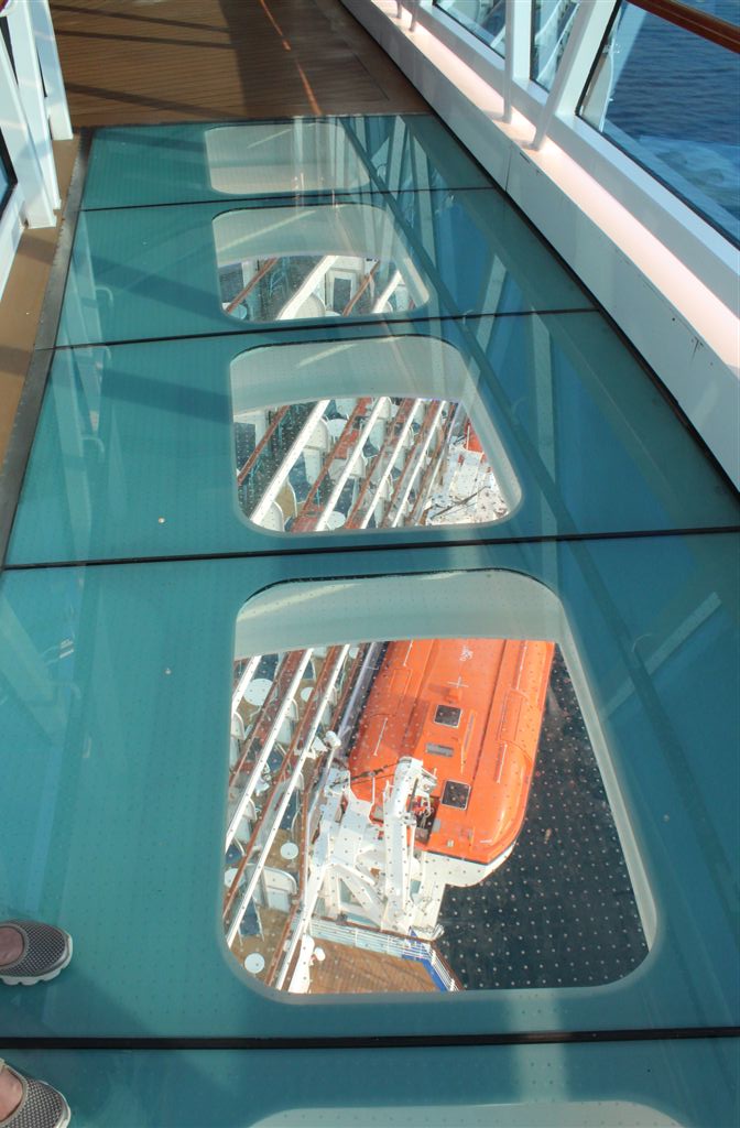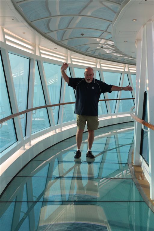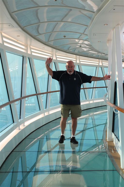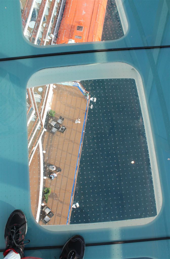 [One of the advertising ploys of the new ship was that it has a see-through skywalk, where you can look down thousands of feet below you. The supervisor caught me doing the death defying act of trying to maintain my balance as I crossed over the dangerous chasm!]