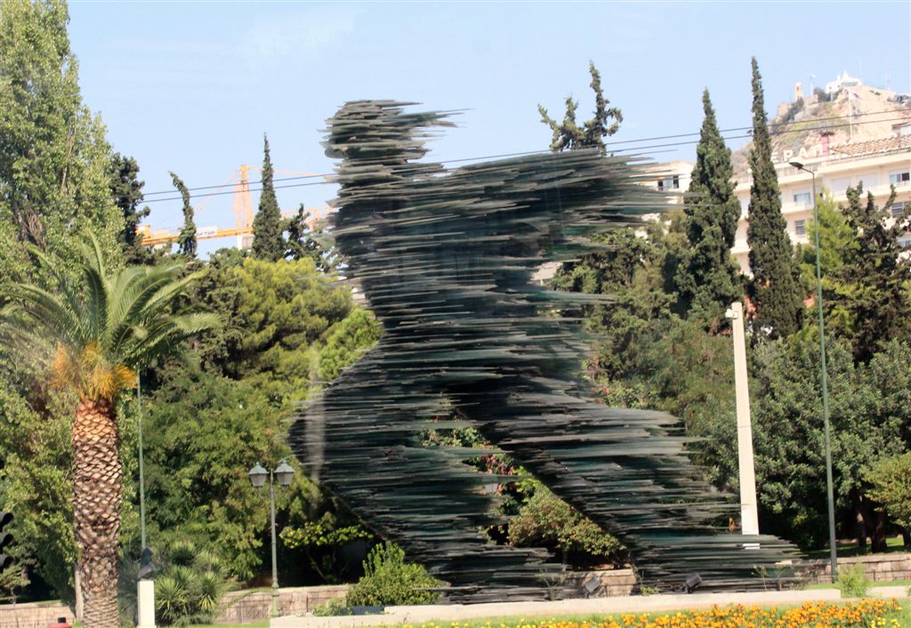 [“The Runner,” 1988, a 30-foot high statue made of stacked panes of green glass. Christiana mentioned how many tons the thing weighs, but do you think I could find it on the internet?]