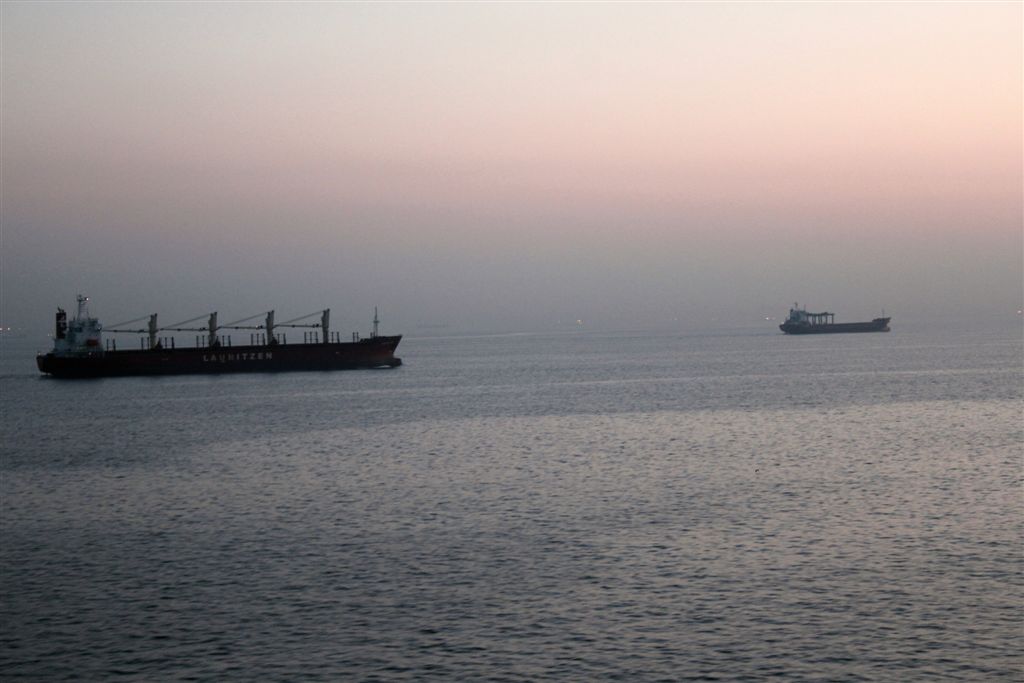 [The boats are gathering in the Bosphorus. Apparently the limited width of the strait requires one-way traffic – so these ships are waiting their turn for when the flow reverses.]