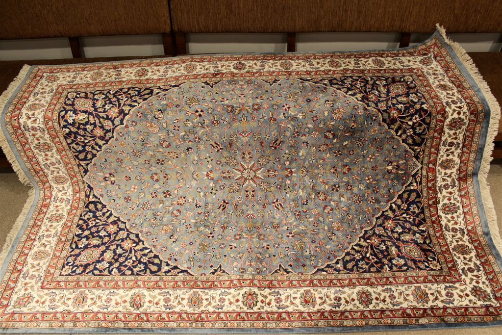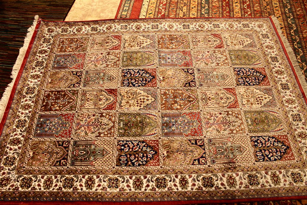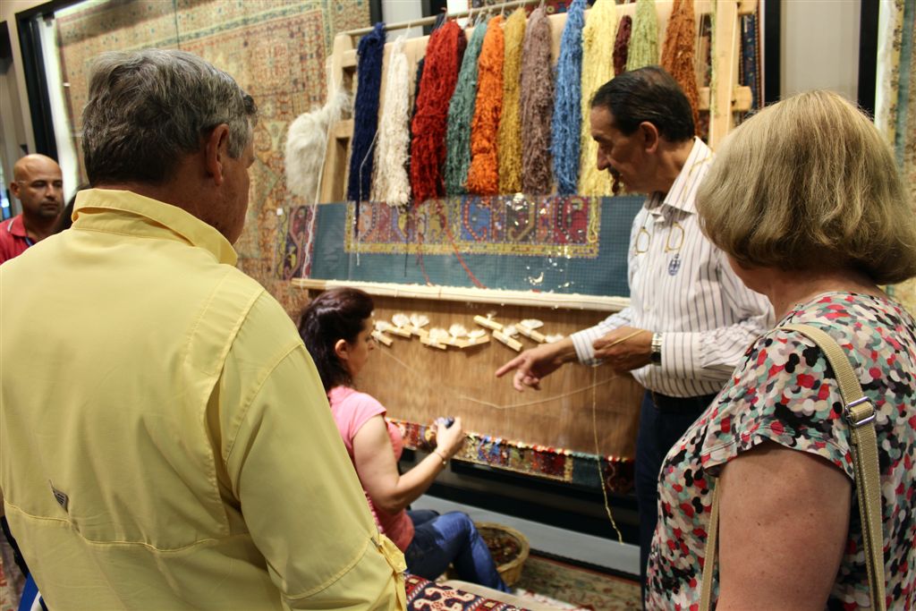[On to the neighboring rug store. The weaver is making a silk rug, double knotting so fast she had to slow down for the demonstration. It will take her two years to make this rug, and it will last 300 years. The cost will be about the same as a year’s tuition at St. Olaf.]