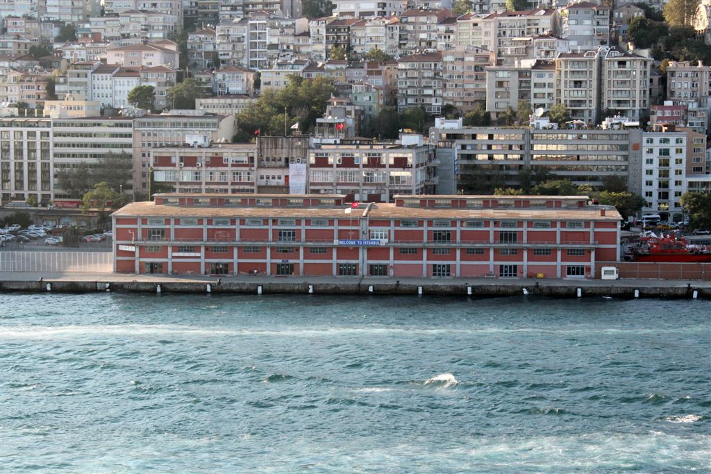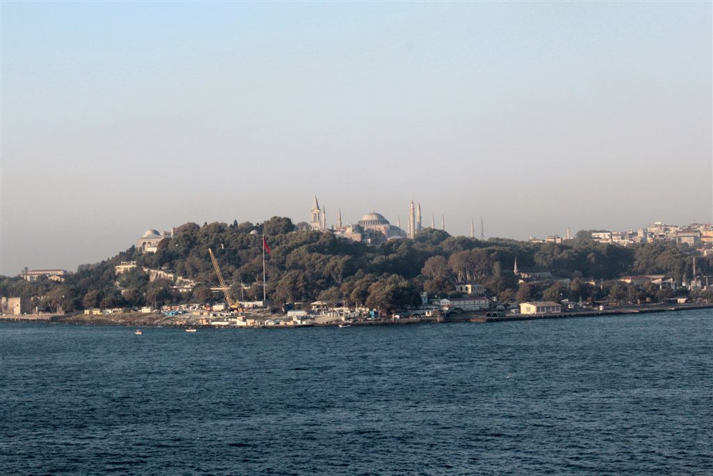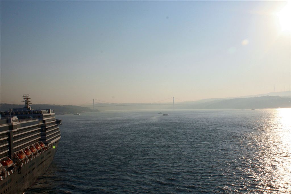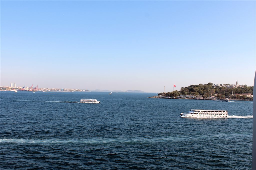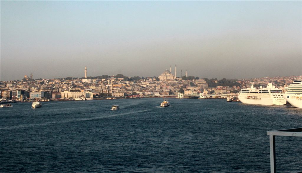 [Coming into port. So, how we got here – coming up from the south through the Aegean Sea, to the Dardenelles, then the Sea of Marmara (where we took the first photos of the mosques), and rounded the bend into the Bosphorus, which connects to the Black Sea to the north.]