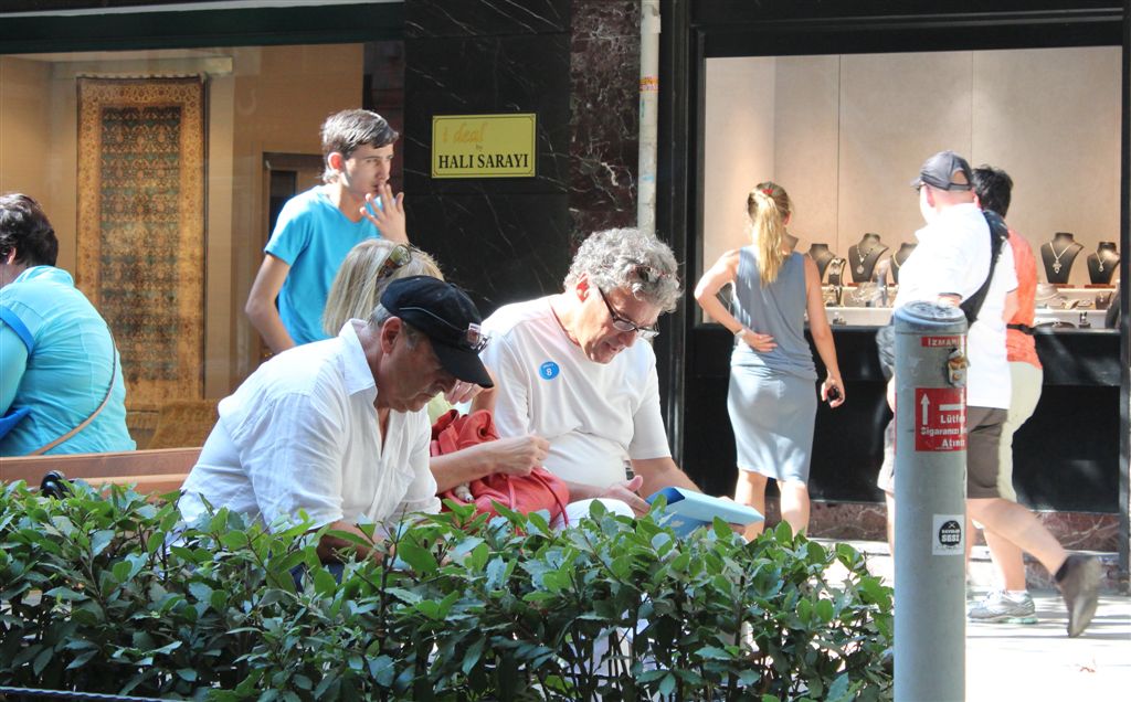[Although they weren’t giving us “the hard sell” (wink, wink, nod, nod), they had several guys roll about 20 different rugs – plus they gave us Turkish coffee and Bill & I accepted a small “adult” beverage. The rugs were beautiful, in silk, wool, or cotton – but none of us were willing to make that kind of 5-figure decision on such short notice.]