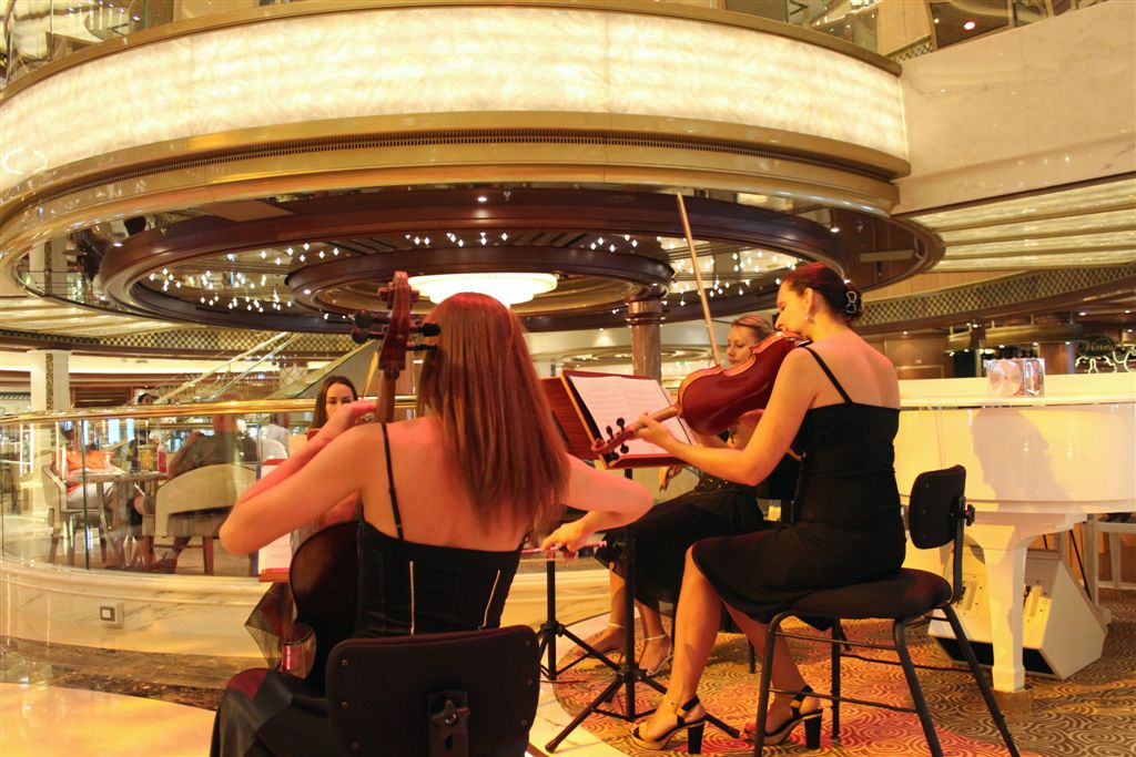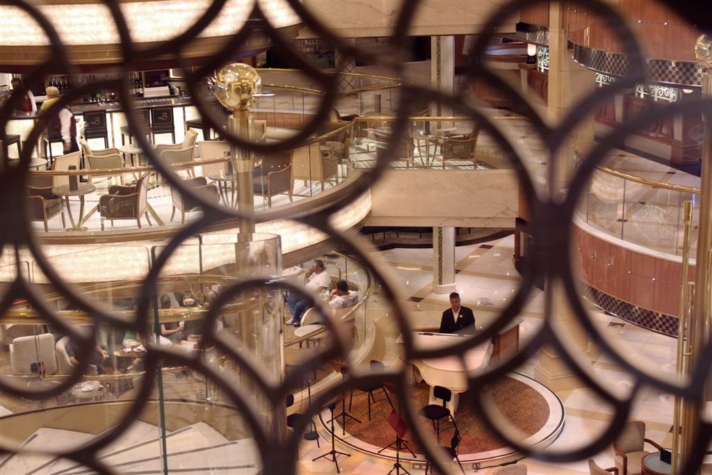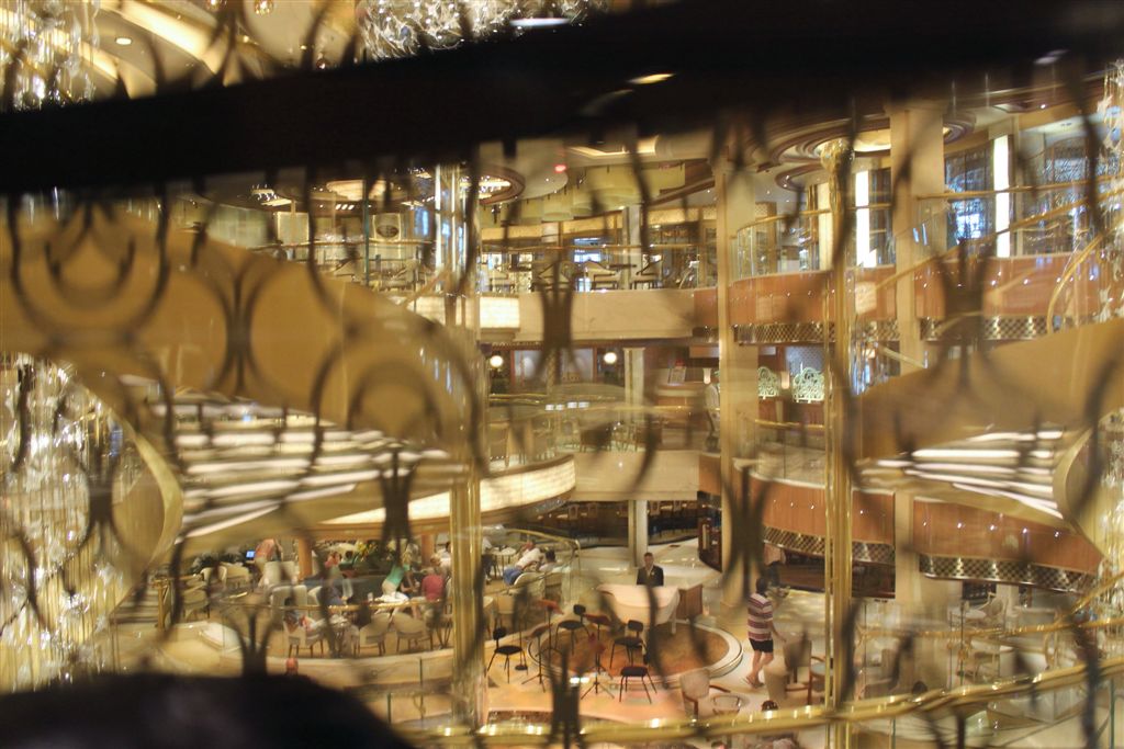 [Back on board our ship, going up the glass elevator looking down on the atrium.]