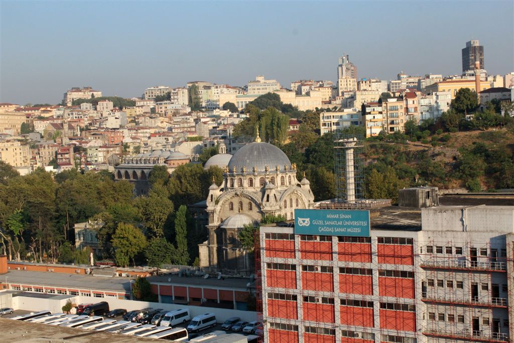 [The supervisor likes to be served. So, on some mornings, we went to our dinner restaurant. And served we were. A line of wait staff greeted us at the door. Then approximately 27 of them would monitor our table – stuff like fresh coffee poured after each sip. Actually, I found it a bit overwhelming. But our first photos of Istanbul, coming up, were shot through this window.]
