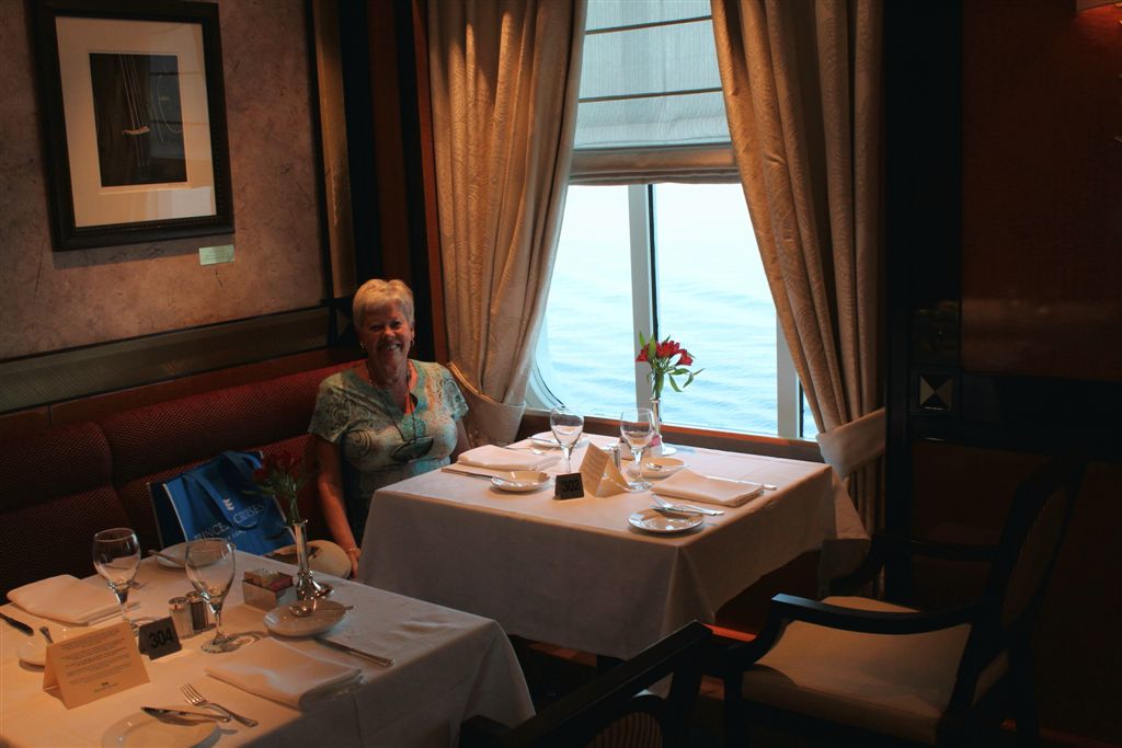 [Oh, it’s the girls in their “pick them up as you enter scarves and drop them off when you leave.” My naked head was fine as it was. Of course, we were also shoeless – I believe the supervisor was carrying them in her “Princess Cruises” complimentary bag.]