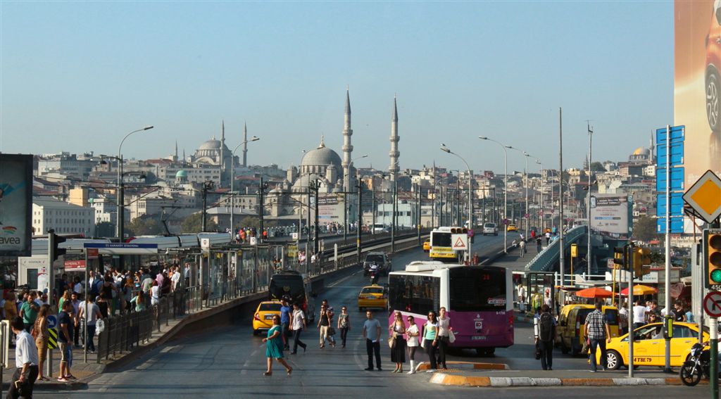 [We’re heading to the mosques, crossing the Galata Bridge over the Golden Horn. Cool!]