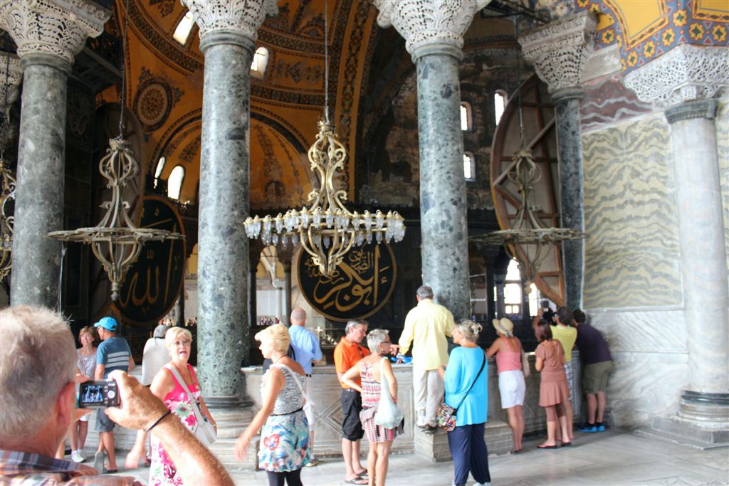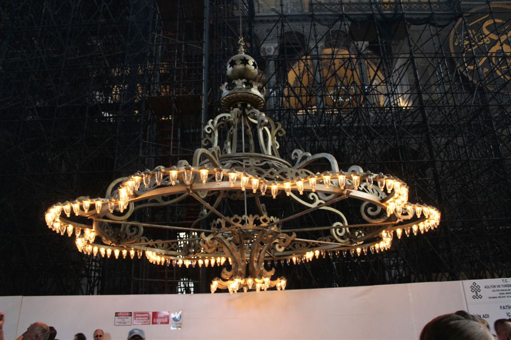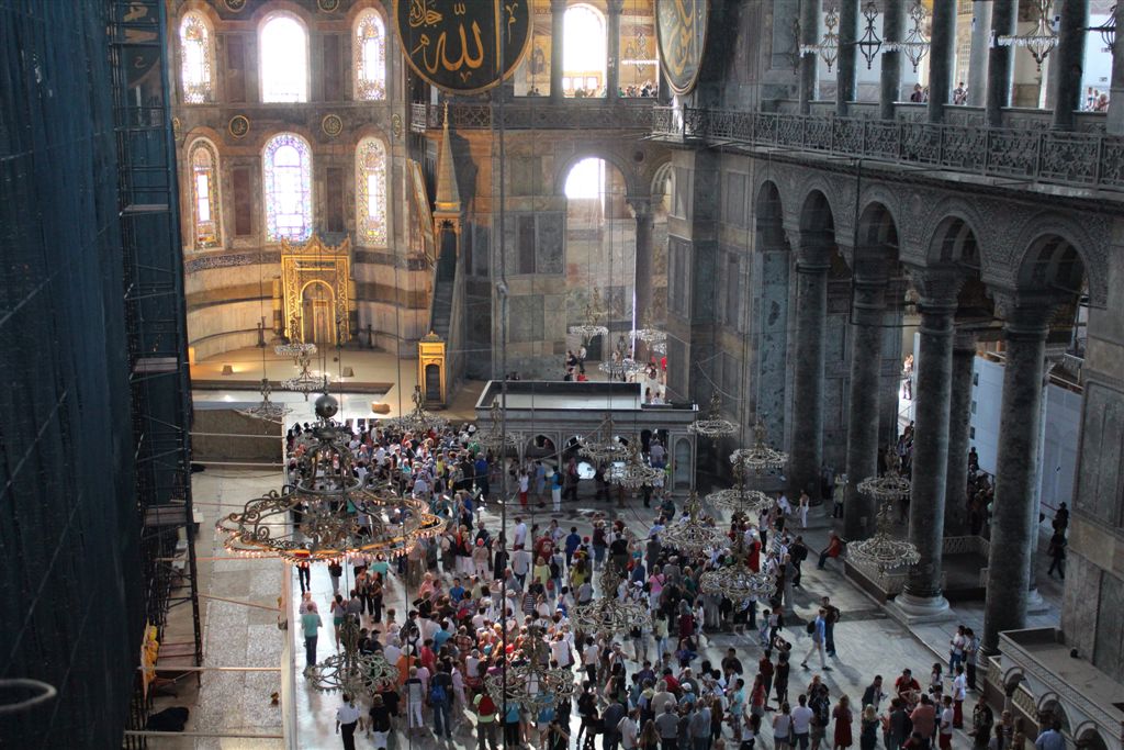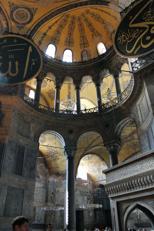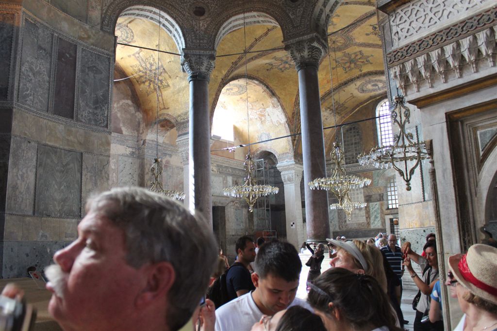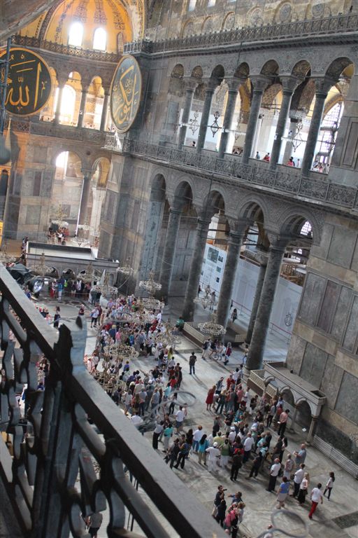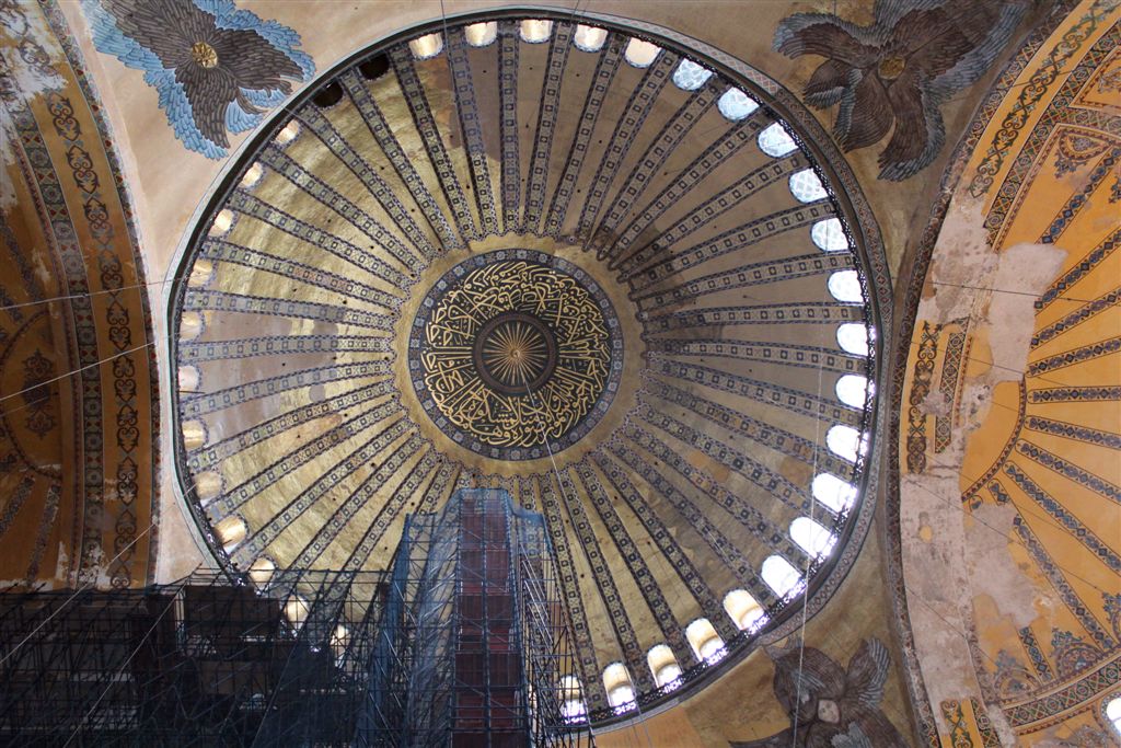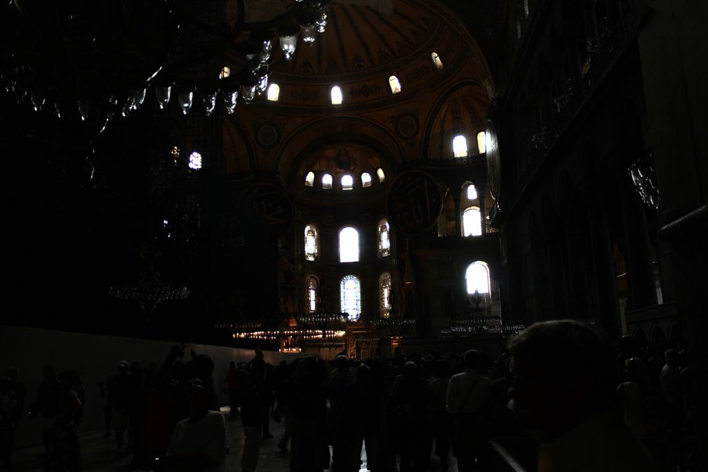 [Ayasofya was built in 537 AD. It is more than 1,000 years older than the Blue Mosque. The dome is an incredible 182 feet above the floor. The finest example of Byzantine architecture, it is said to have changed the history of architecture. For some reason thereafter, domes fell out of favor for a thousand years. And when humanity decided to build them again, they had forgotten how? I guess the original guys forgot to leave instructions on a flash drive. Ayasofya became a secular museum in 1935.]