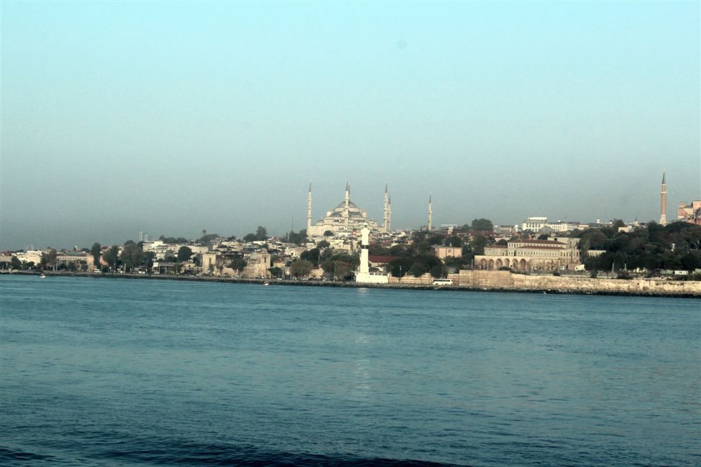 [Dominating the Istanbul “skyline” here is the Blue Mosque (on left, 6 minarets) and the Ayasofya (on the right). These two mosques dominate the “must see” list of things to see in Istanbul.]