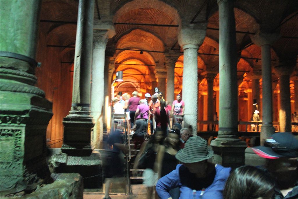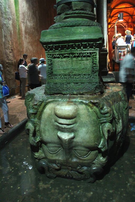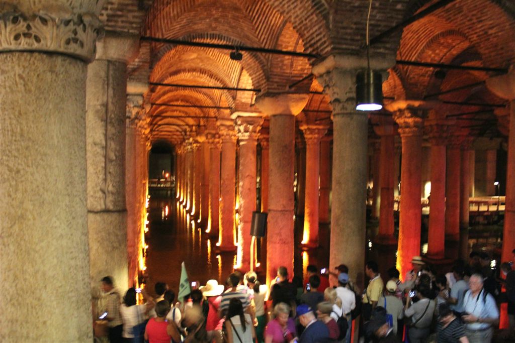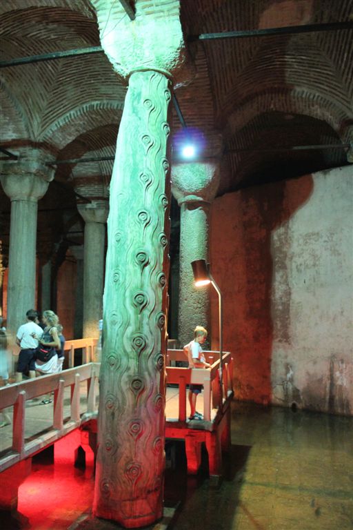 [We went back outside . . . and then underground. When Cemil said he was taking us to “the underground,” I assumed the Istanbul subway? Nope, the Basilica Cistern! 😉 One of several hundred, this is the largest at 453′ by 212′ and supported by 336 marble columns (recycled from other places) all 30 feet tall. The place held almost 3 million cubic feet of water, making it a difficult place to defeat by siege. An amazing sight!]