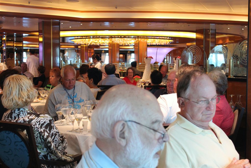 [So, Thursday, August 29 (Little Mayo Johnson’s 66th, exactly one week ahead of mine), was a day at sea. Likely spent around the swimming pools, probably wondering what colors the Russian “models'” bikinis would be that day. 😉 I seem to recall I read a lot of “Bad Monkey.” The photographic evidence (above) indicates we had another formal dinner that night – and once again I had to crash it with a short-sleve shirt. “The March of the Baked Alaskas” must be a cruise ship staple – I remember the chefs did this on our Alaska cruise as well.]