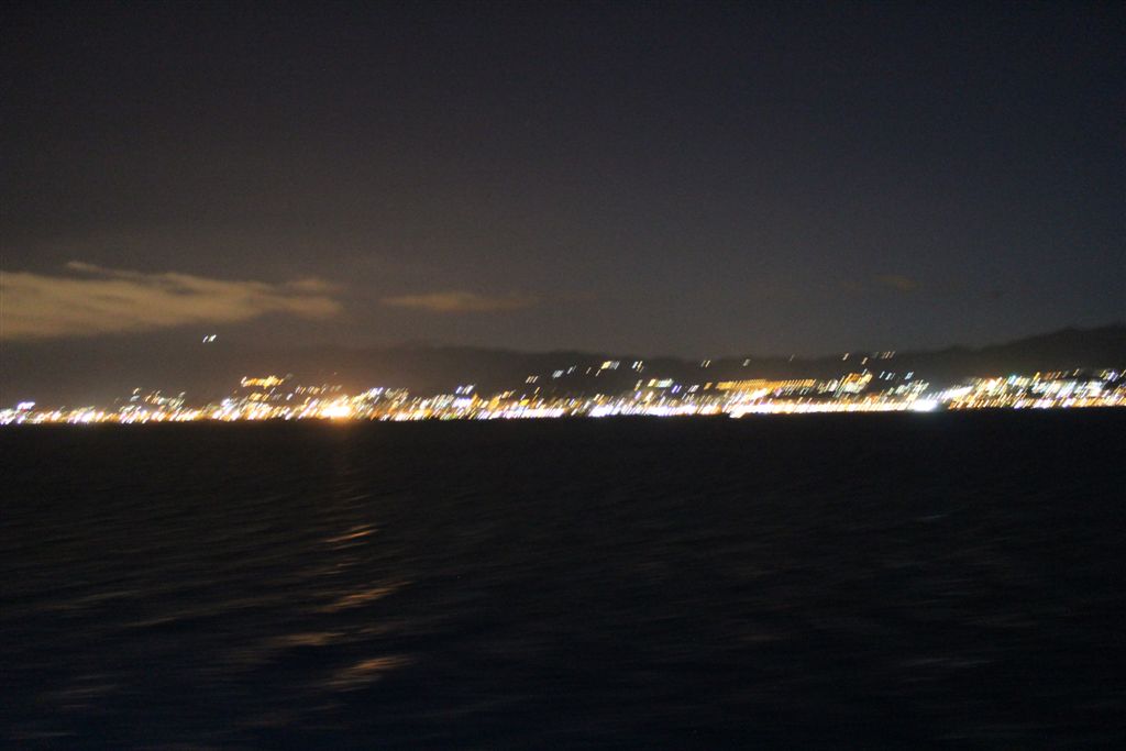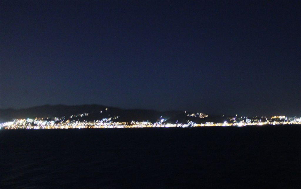 [Bill and Anne called as soon as they got back the their room. Come on over, we have lots of lights here. We were about to join them when we looked out our deck. On their side, they were looking at the “toe” of Italy; we were looking at Sicily. 🙂 ]