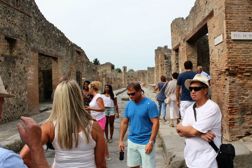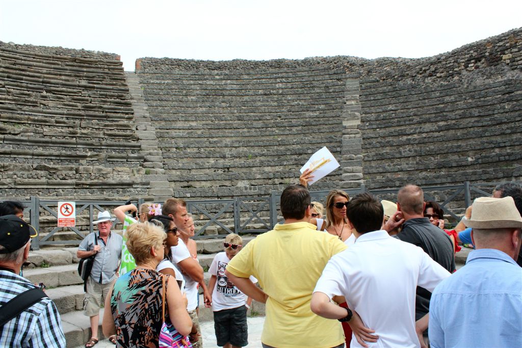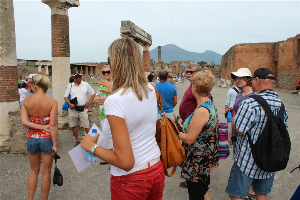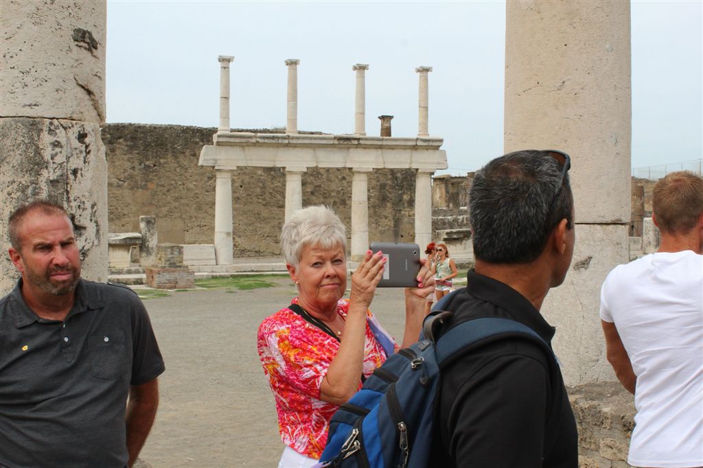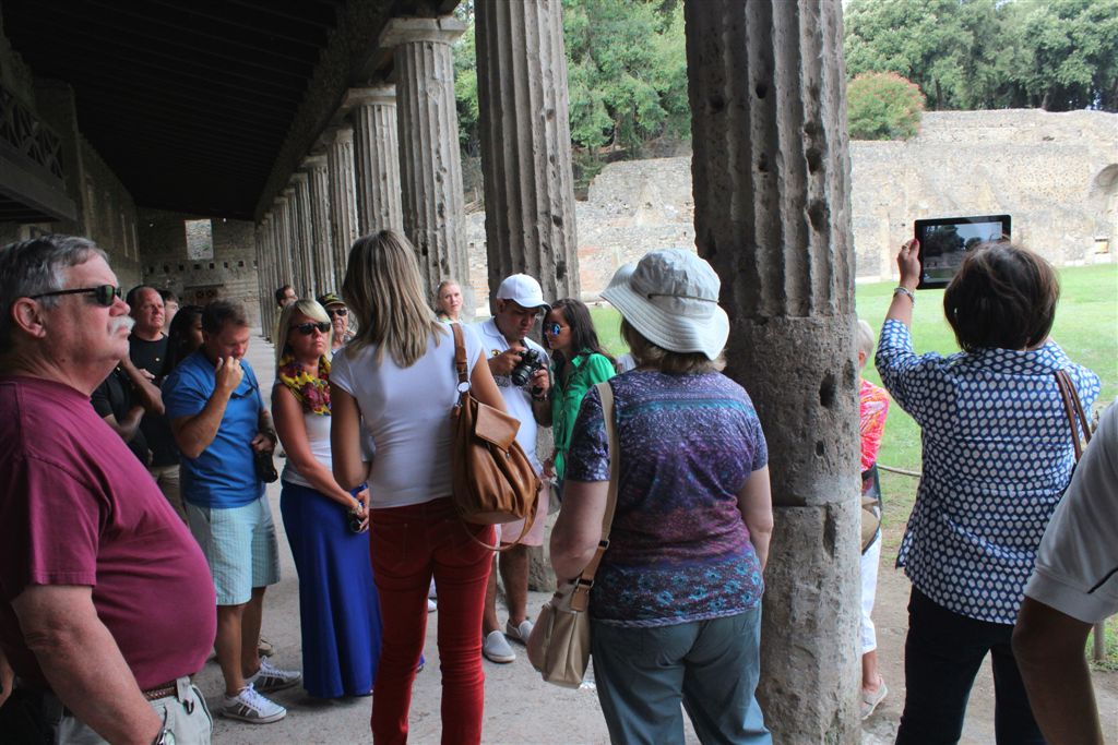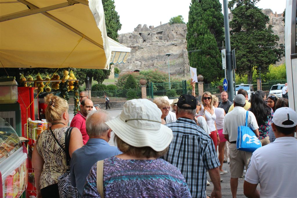 [We assemble for the assault on the ruins. And you meet our guide, Maria (looking at us with sunglasses), for the first time. Like all of our women guides to date, she was statuesque (see they could seen above the crowd?) – that would change in Pisa/Florence. 😉 ]