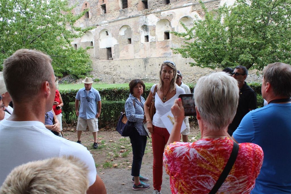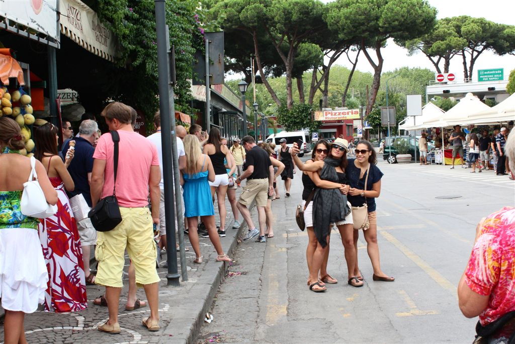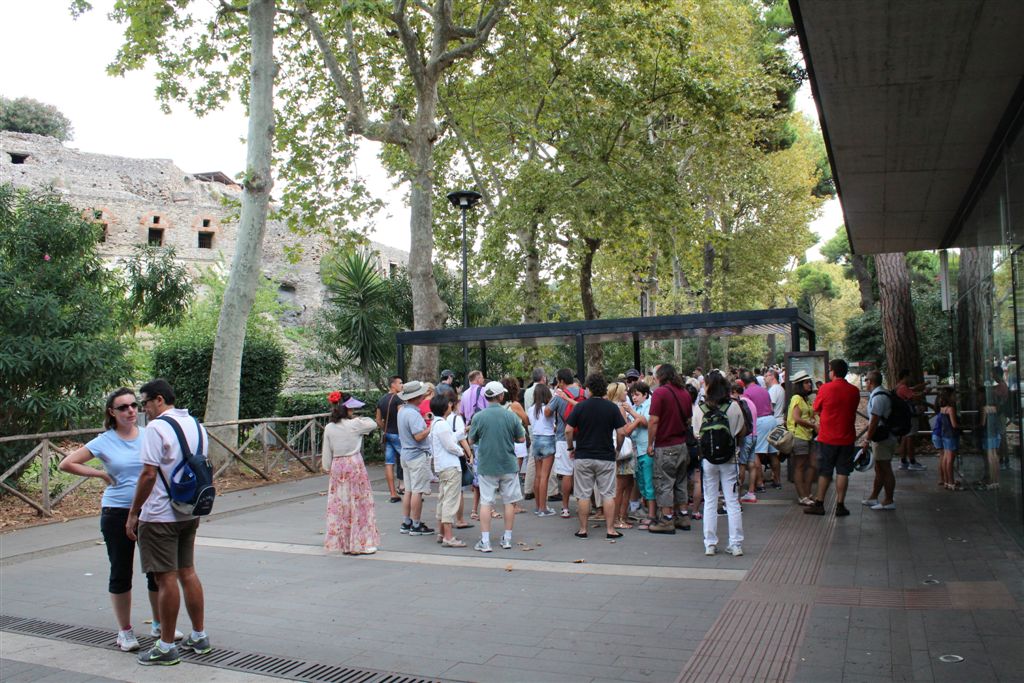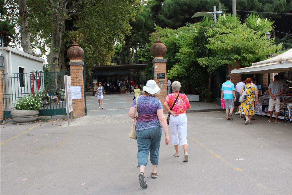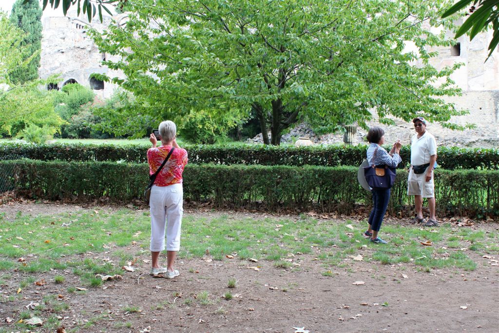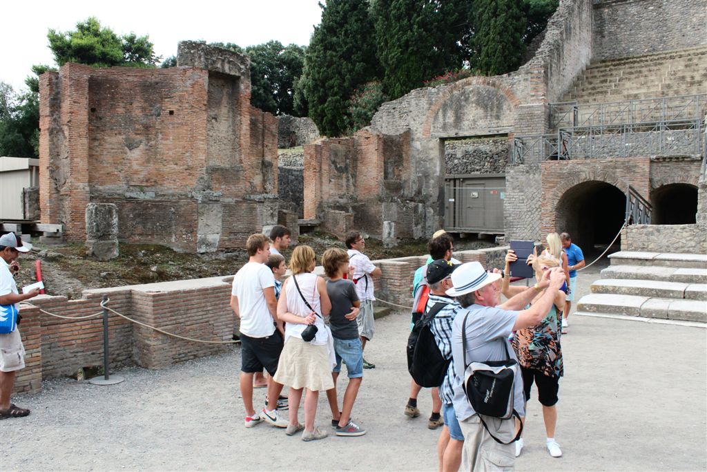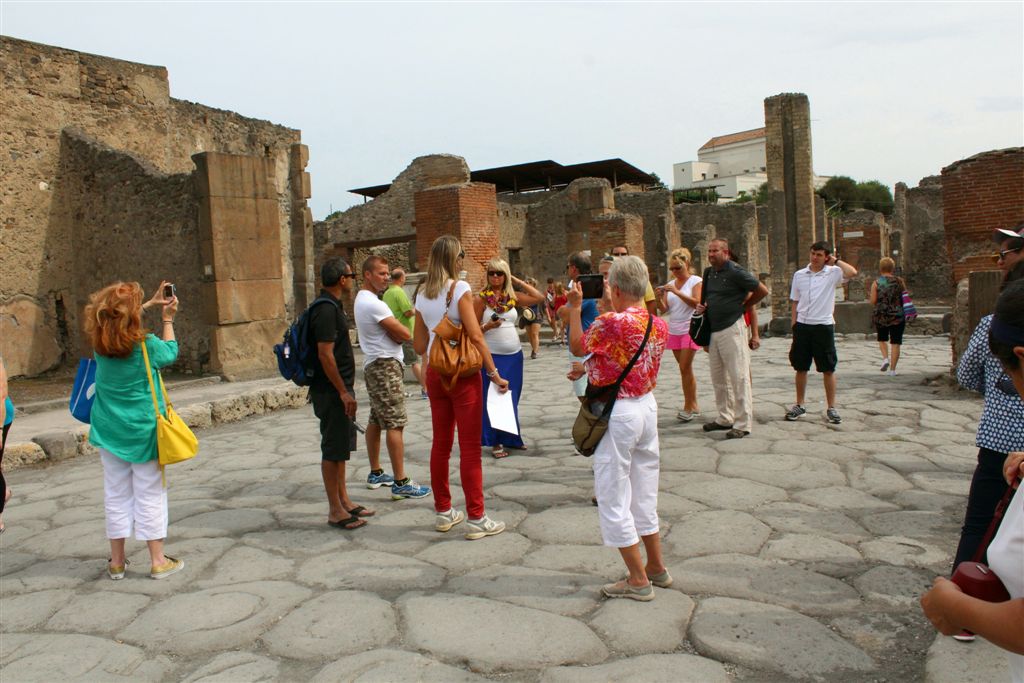 [We assemble for the assault on the ruins. And you meet our guide, Maria (looking at us with sunglasses), for the first time. Like all of our women guides to date, she was statuesque (see they could seen above the crowd?) – that would change in Pisa/Florence. 😉 ]